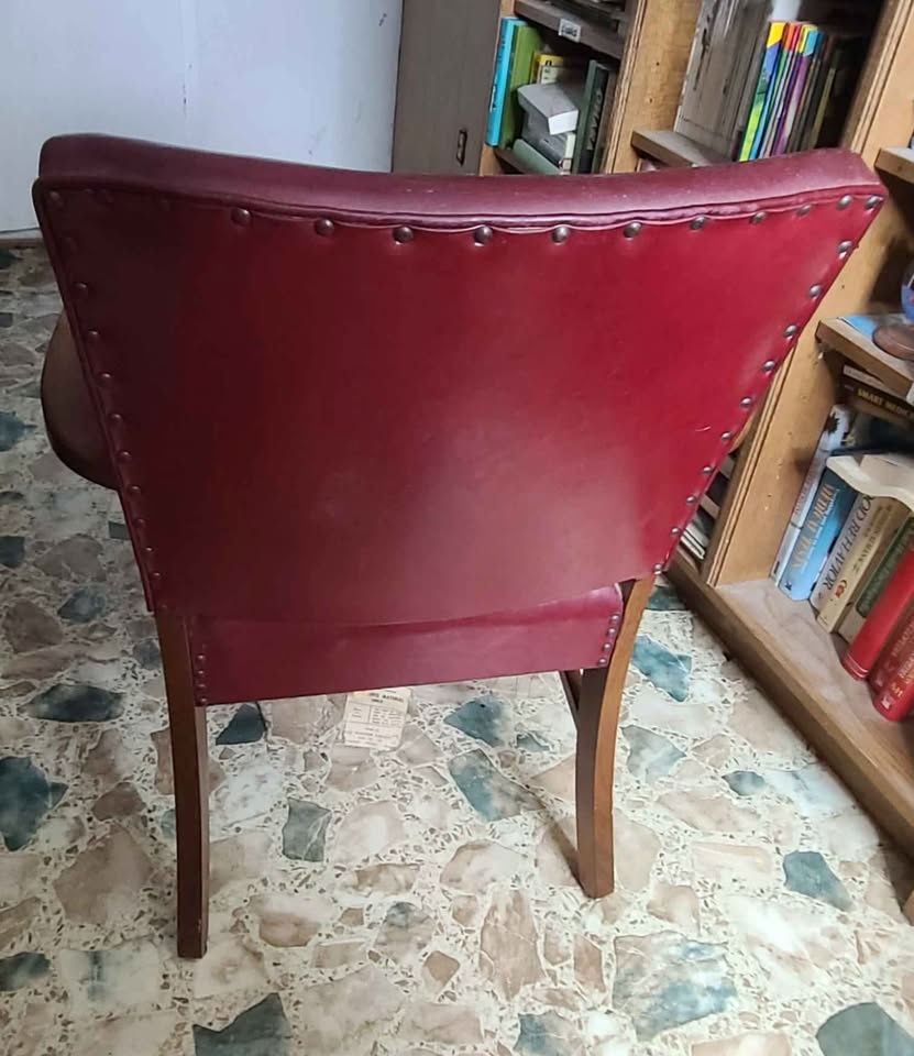 Going through basement cleaning and looking to get this red leather chair to a good home! Super sturdy with good upholstery. Can arrange for pick up at my house. It's a pretty heavy chair, around 40 pounds if I had to guess.