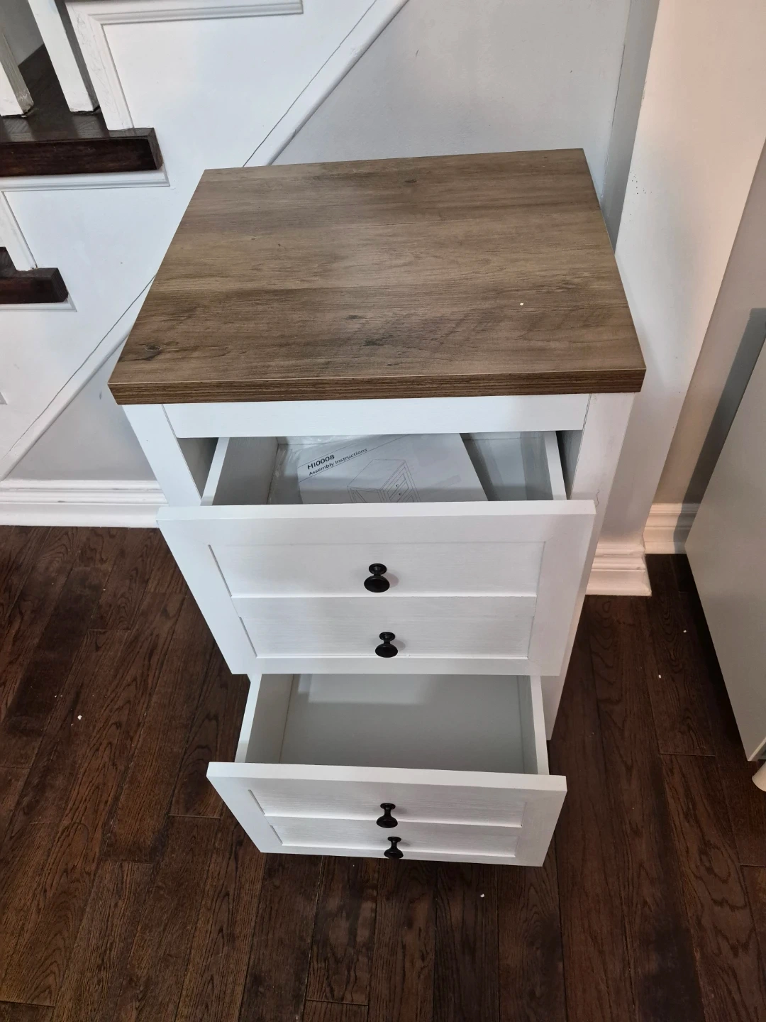 This white nightstand features two drawers for storage and a rustic wood-tone top. It's perfect for keeping your bedroom tidy. The drawers slide smoothly for easy access.