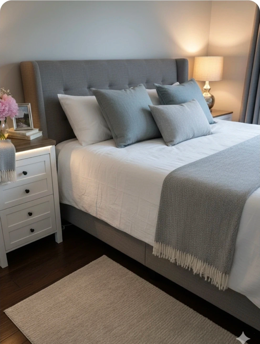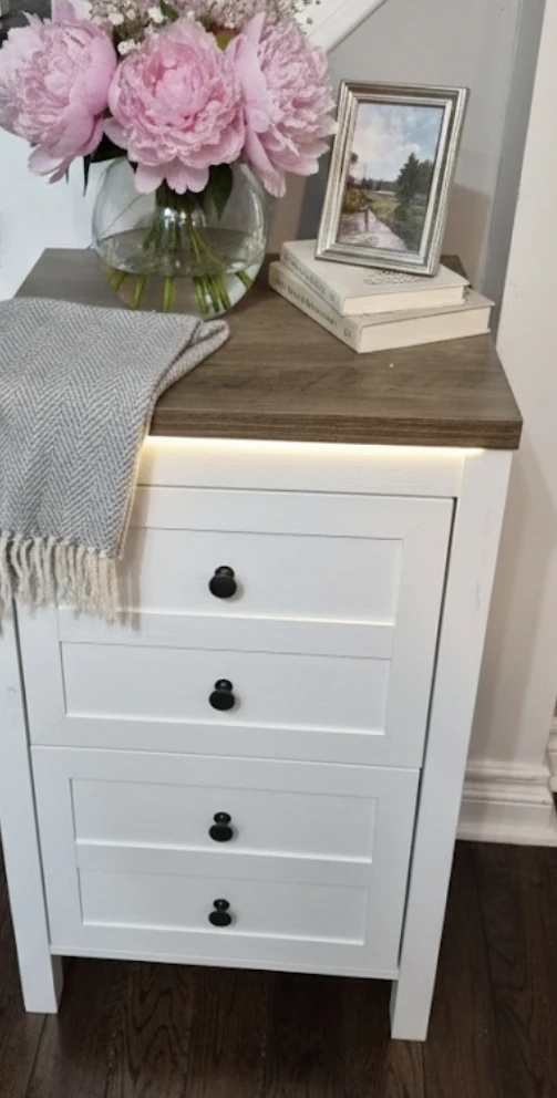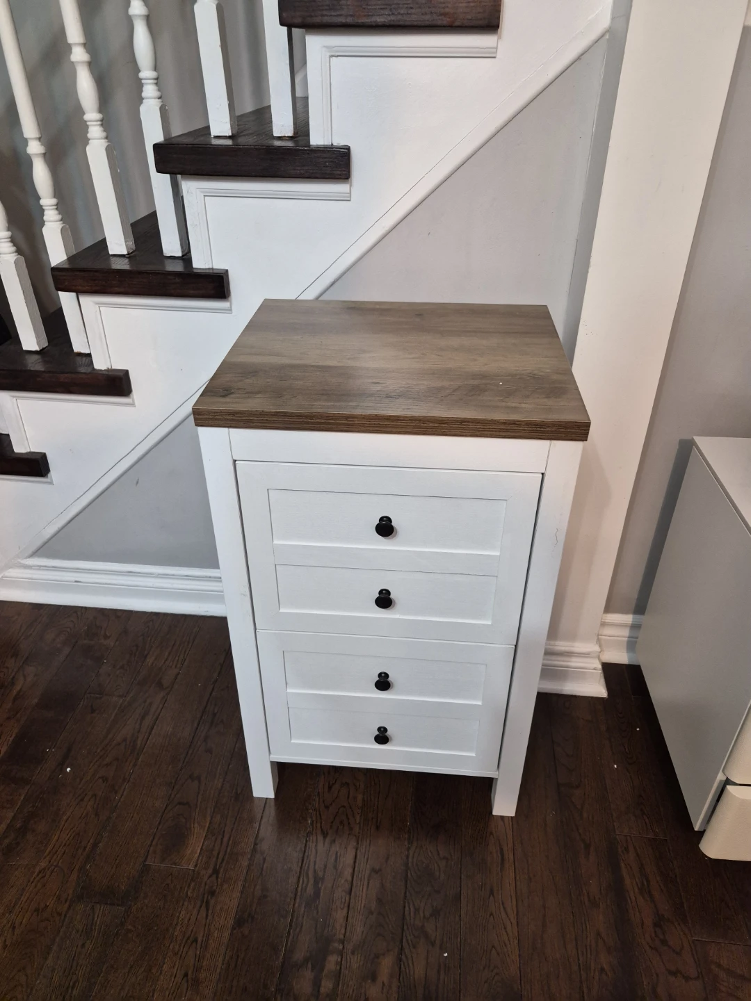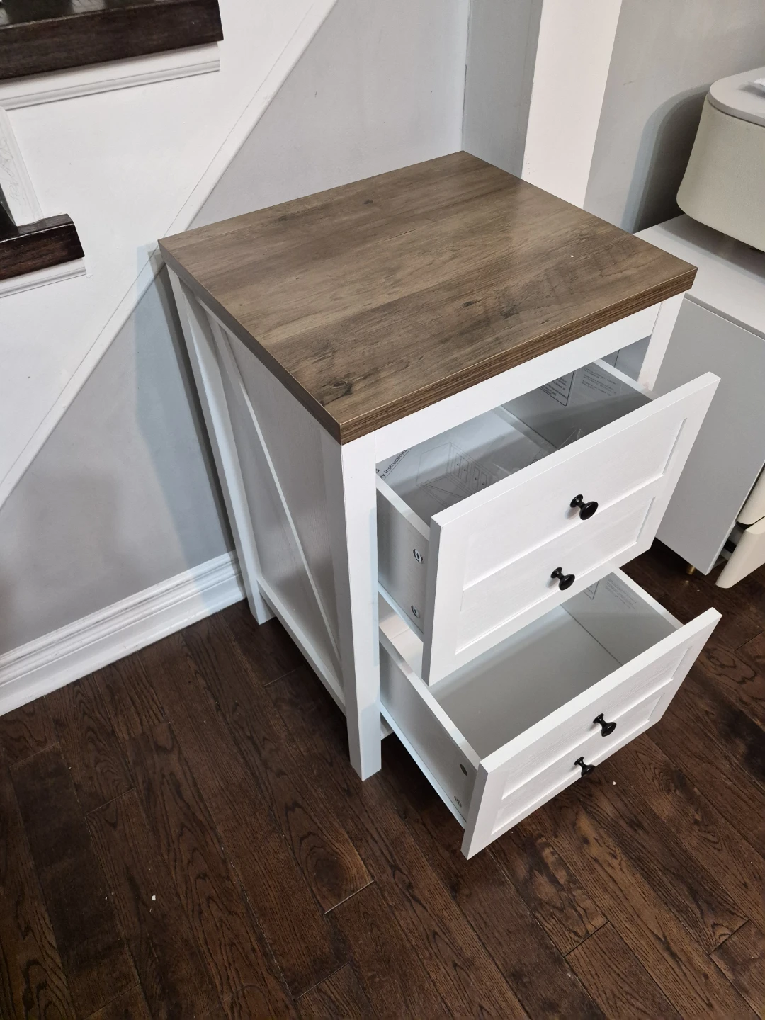 This white nightstand features two drawers for storage and a rustic wood-tone top. It's perfect for keeping your bedroom tidy. The drawers slide smoothly for easy access.