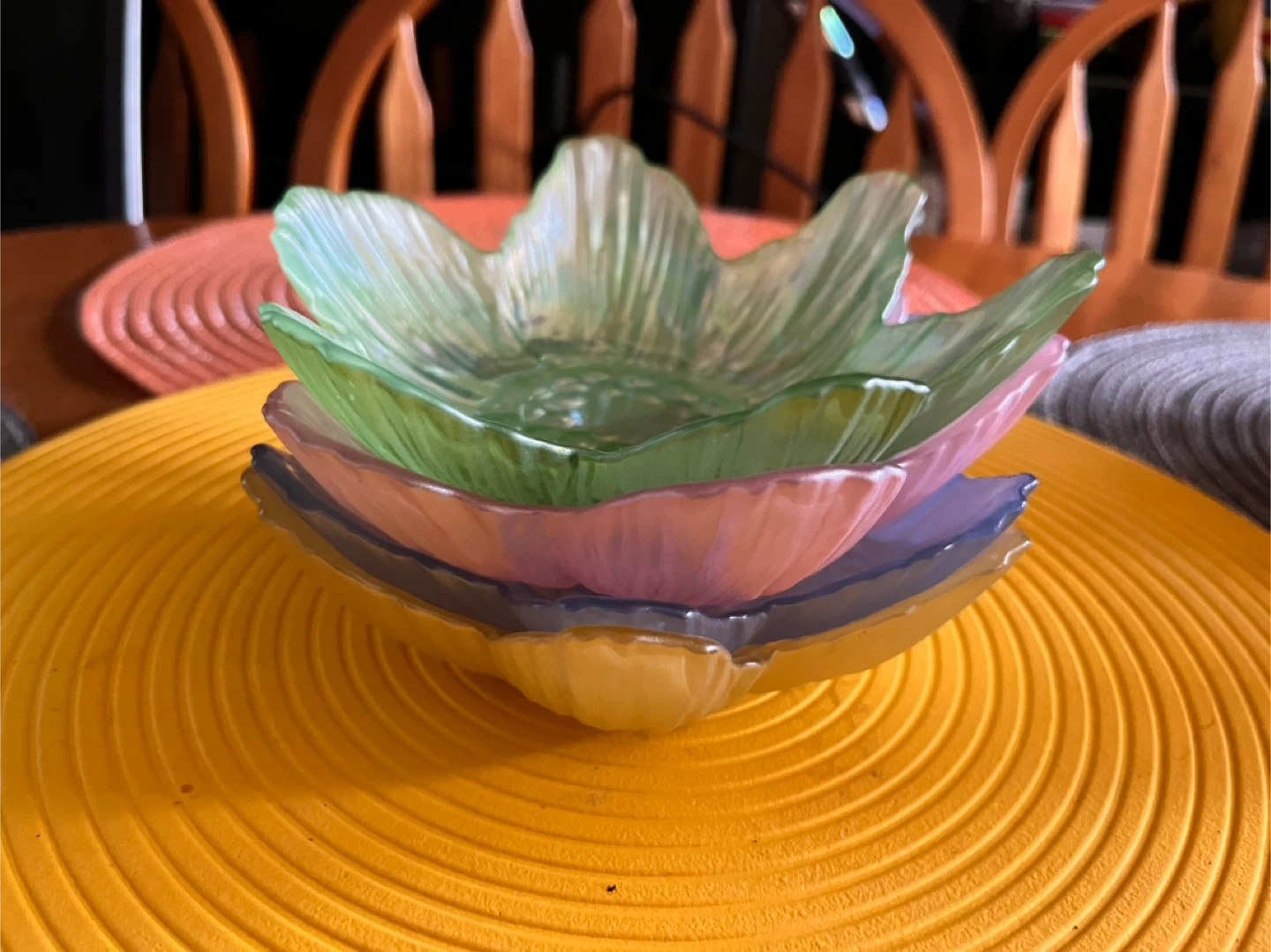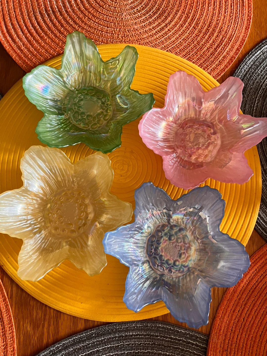 This is a set of four decorative glass bowls. They are shaped like flowers and come in pastel shades of green, pink, yellow, and blue. They're perfect for serving small snacks or dips!