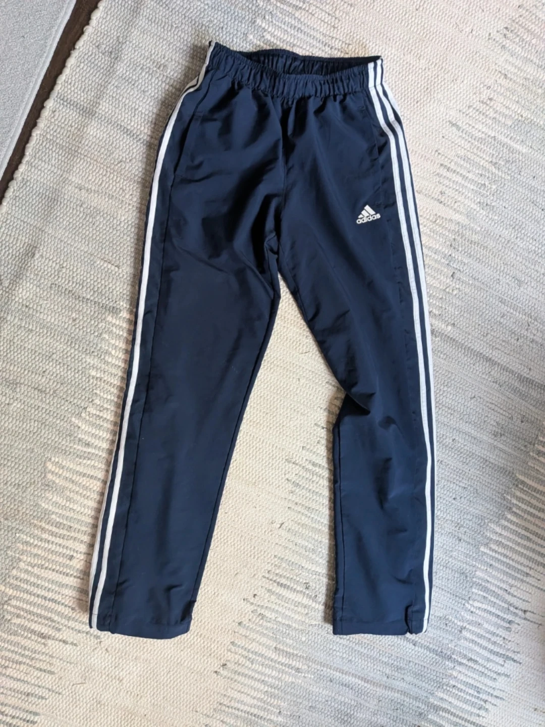 Navy blue Adidas track pants with white stripes. Features a climalite fabric for breathability. Size S. Cinchable ankles. Great condition.