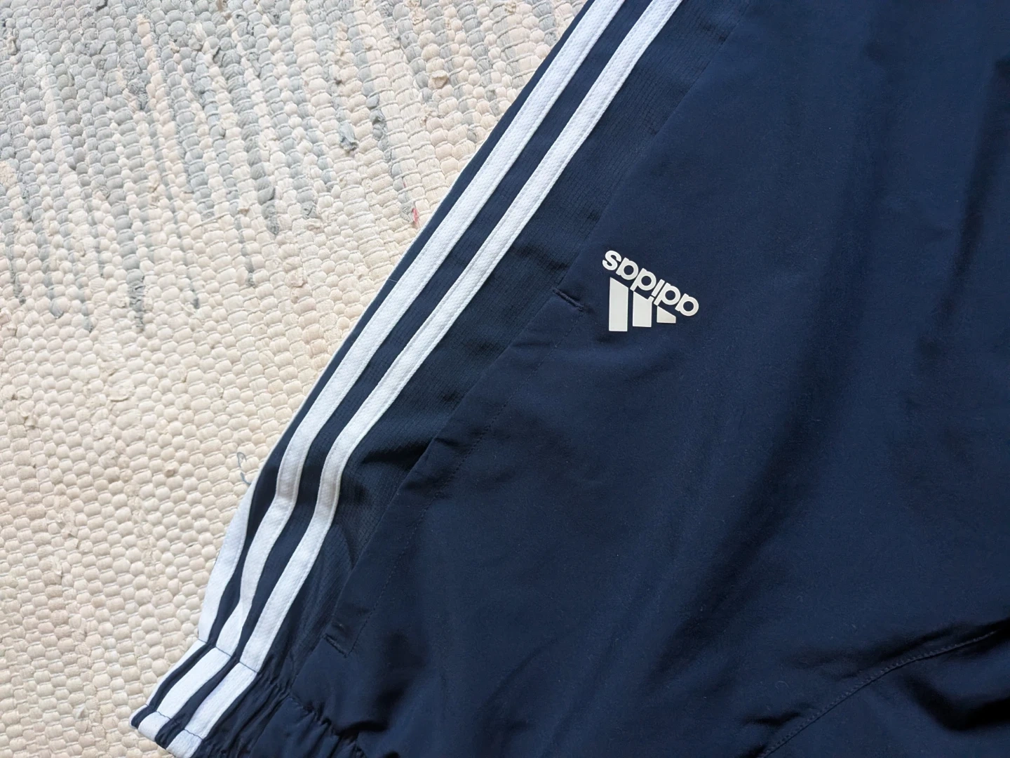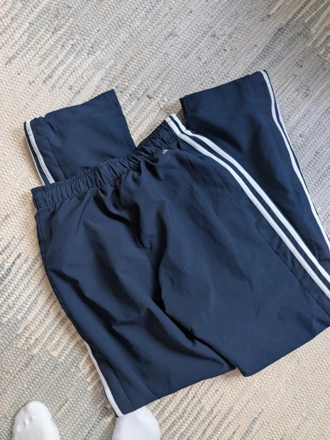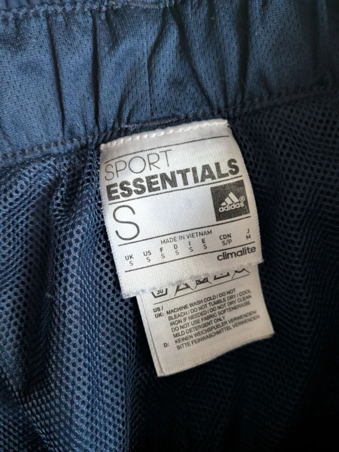 Navy blue Adidas track pants with white stripes. Features a climalite fabric for breathability. Size S. Cinchable ankles. Great condition.