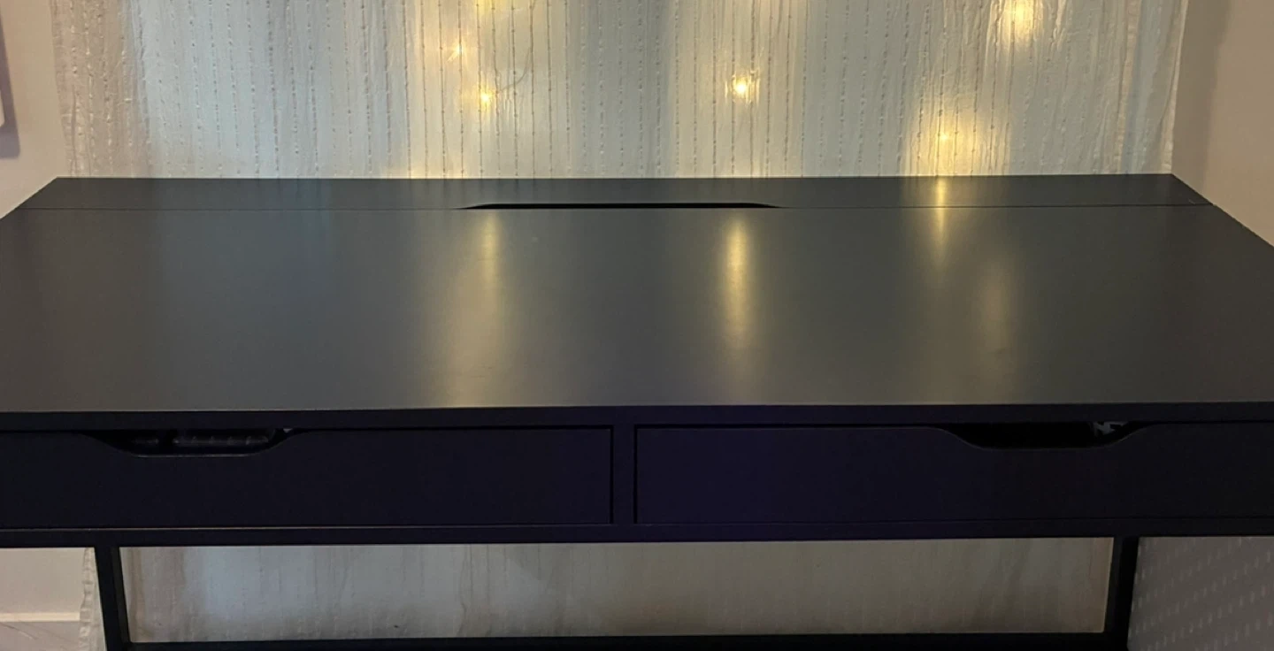 Selling Ikea limited navy (black-blue) desk. It has a cutout under the desk for monitor arm (not visible when built in cable management lid is closed) and some scratches from usage as shown in the photos.