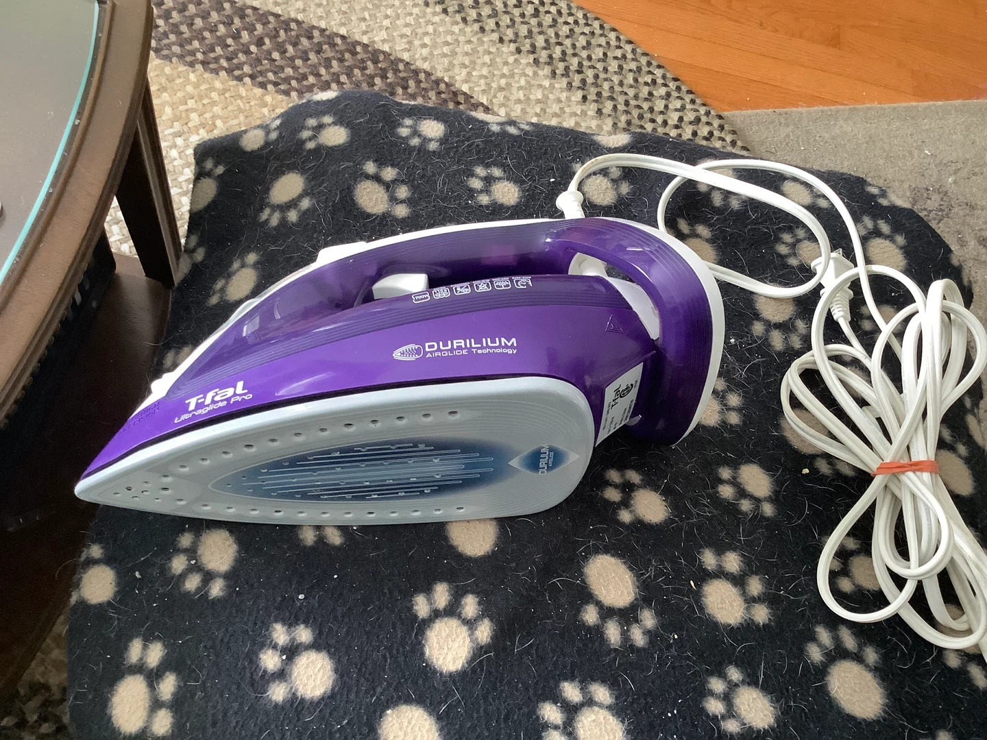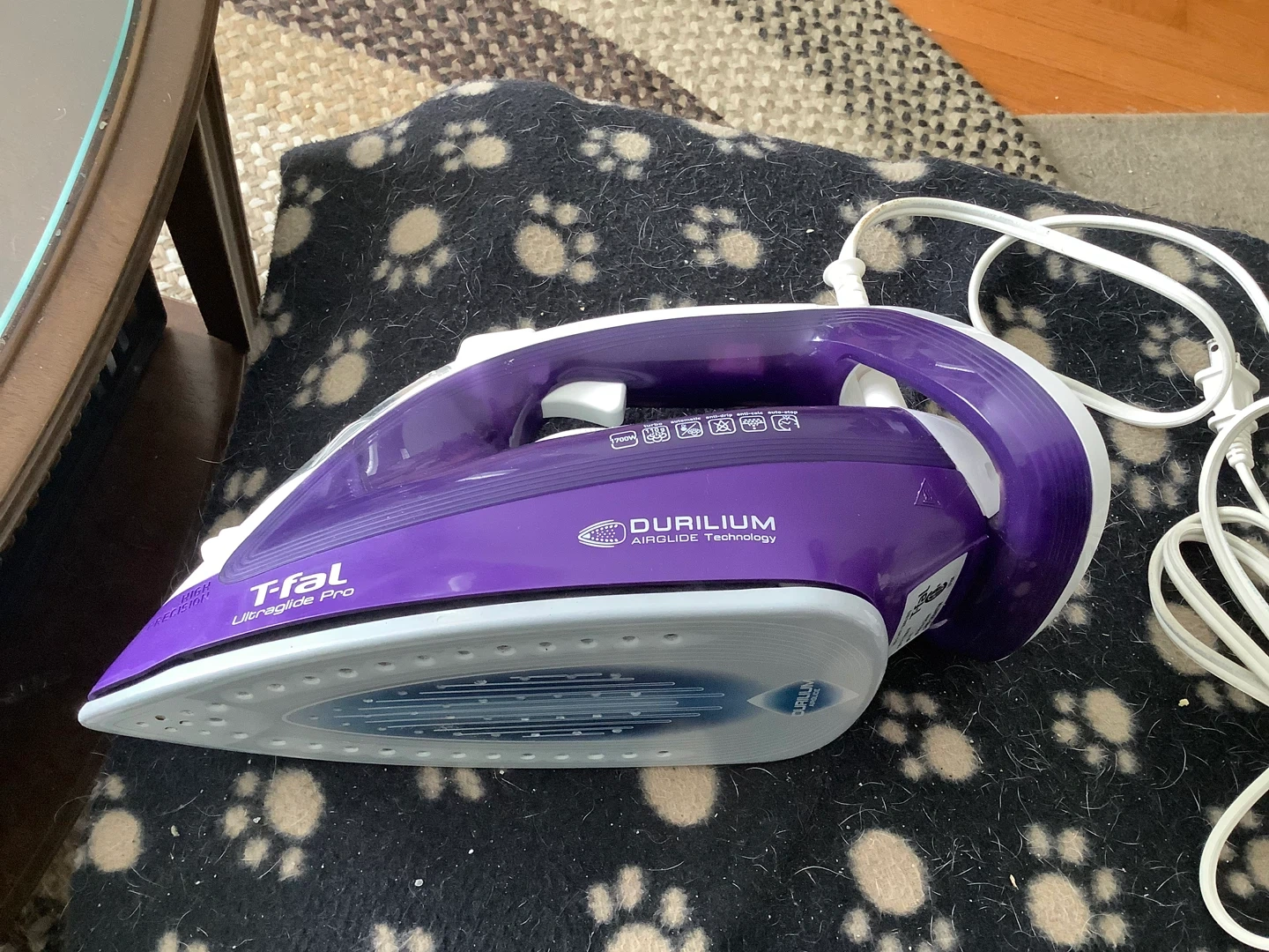 This T-fal Ultraglide Pro steam iron features a Durilium Airglide soleplate. It's designed for easy glide and efficient ironing. This iron is 1700 W and operates at 120 V. It's purple and white.