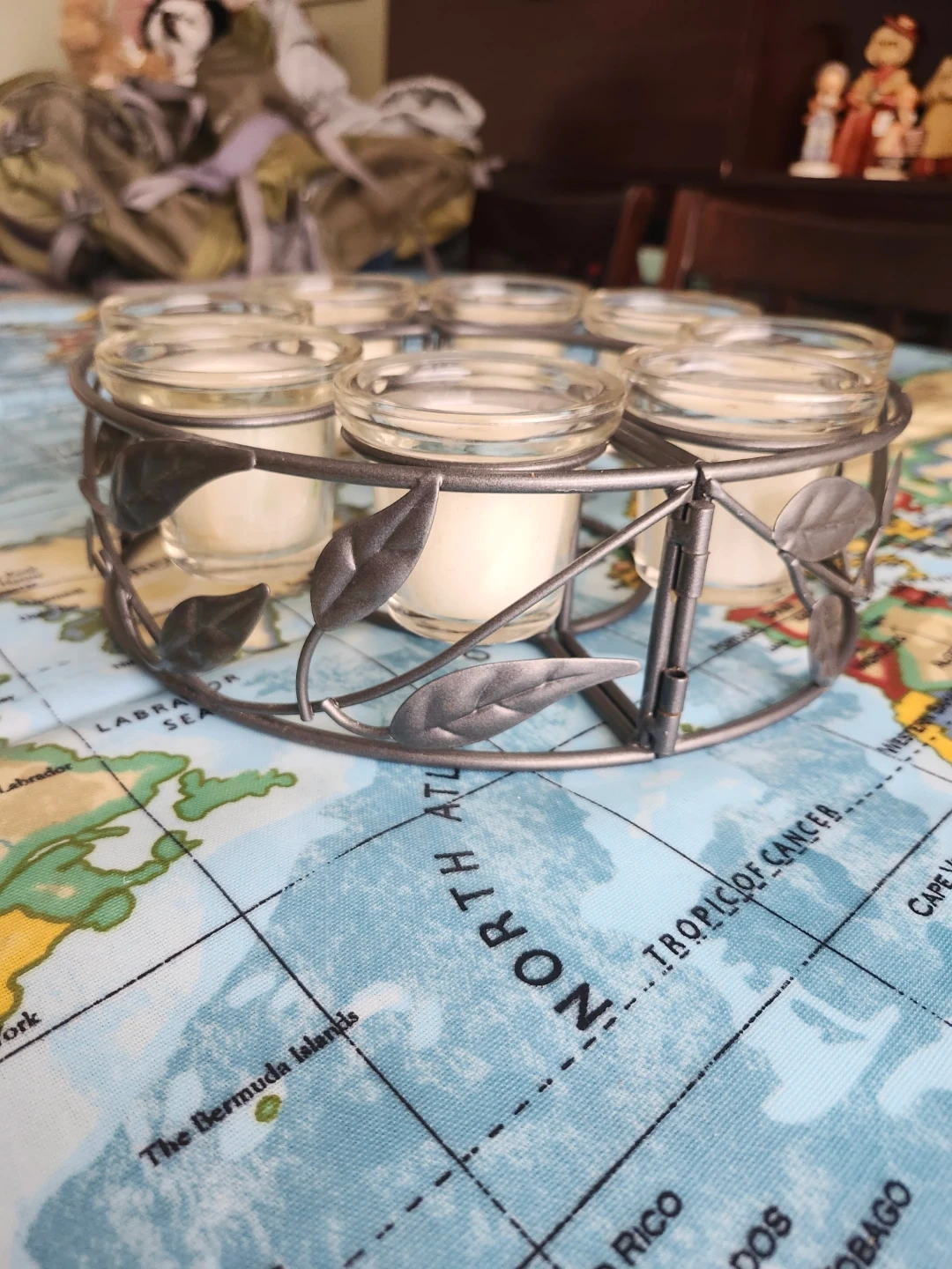 Selling a lovely candle holder that comes with eight votive candles. It's in great condition and would be a cozy addition to any room! The metal frame has a leaf design and holds the glass votives securely. Perfect for creating a warm and inviting atmosphere in your home