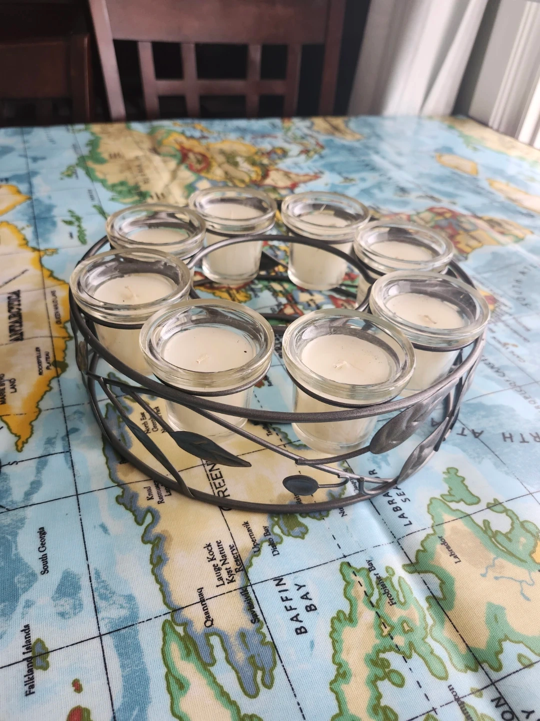 Selling a lovely candle holder that comes with eight votive candles. It's in great condition and would be a cozy addition to any room! The metal frame has a leaf design and holds the glass votives securely. Perfect for creating a warm and inviting atmosphere in your home