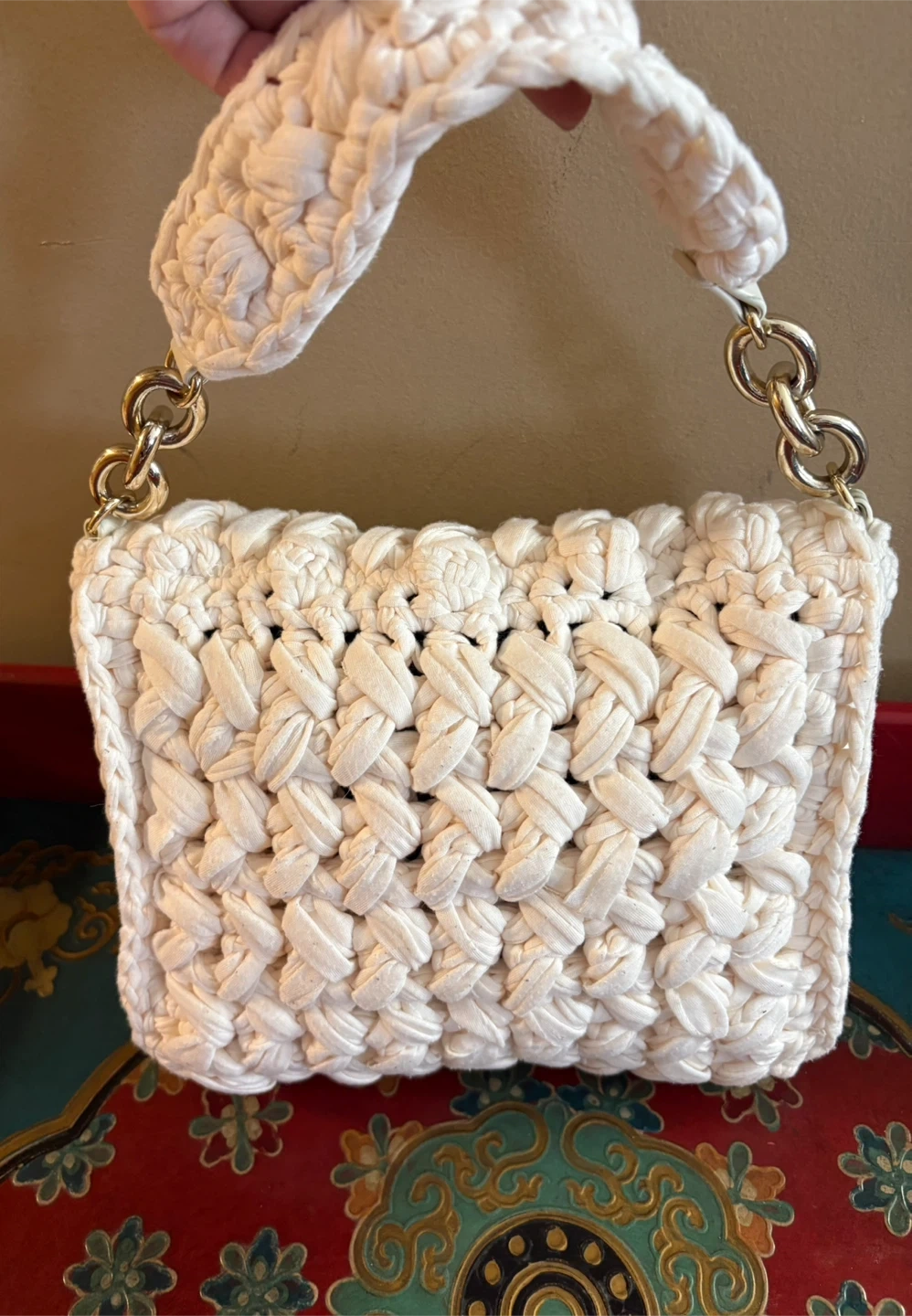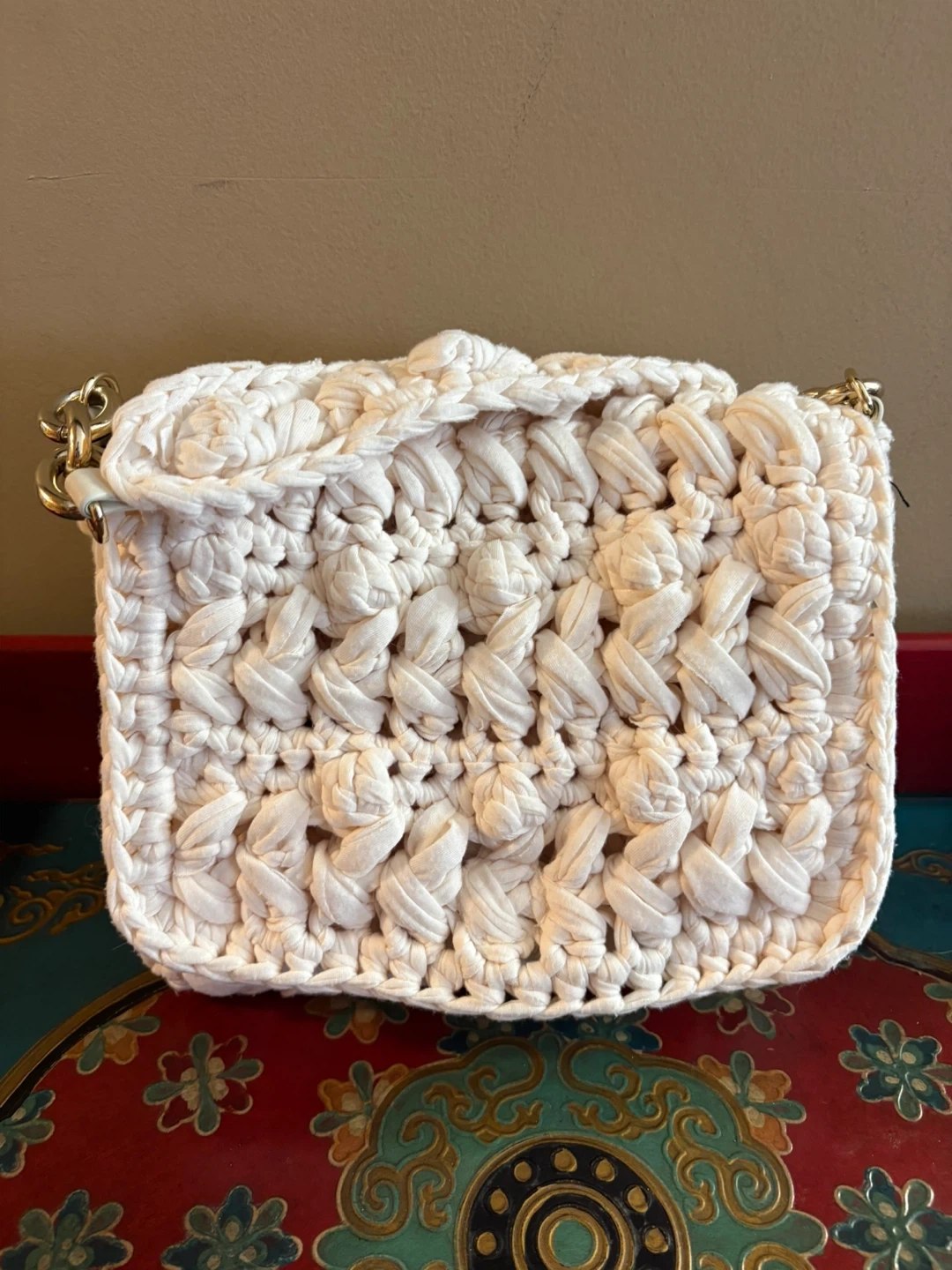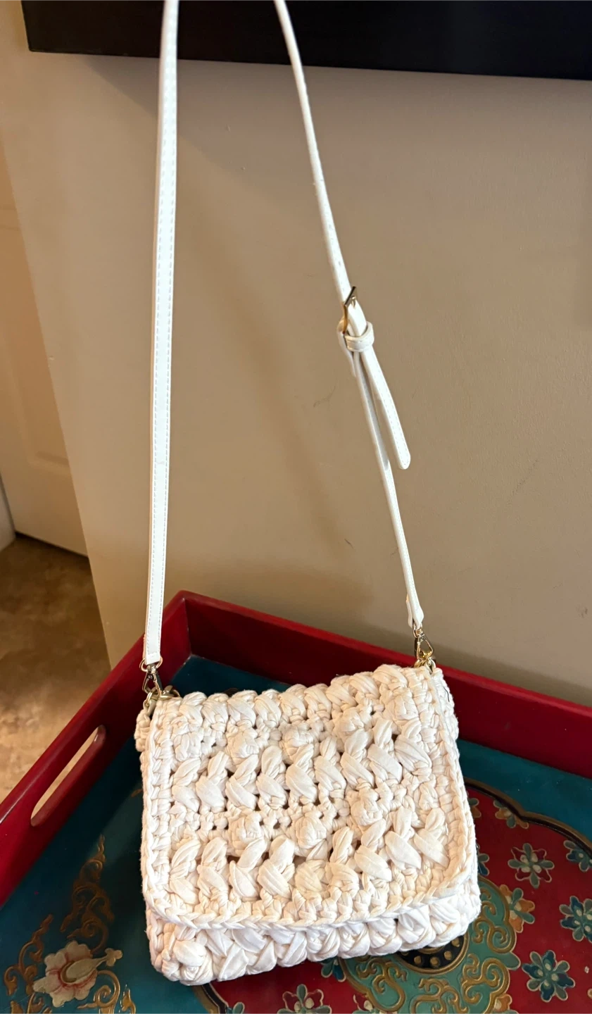 Zara white shoulder bag with a crocheted texture and gold chain detail. It features a flap closure with a snap button. This bag is a great accessory for casual outings! Really original and unique design! Great condition, includes an adjustable strap. Pick up in Chestermere.