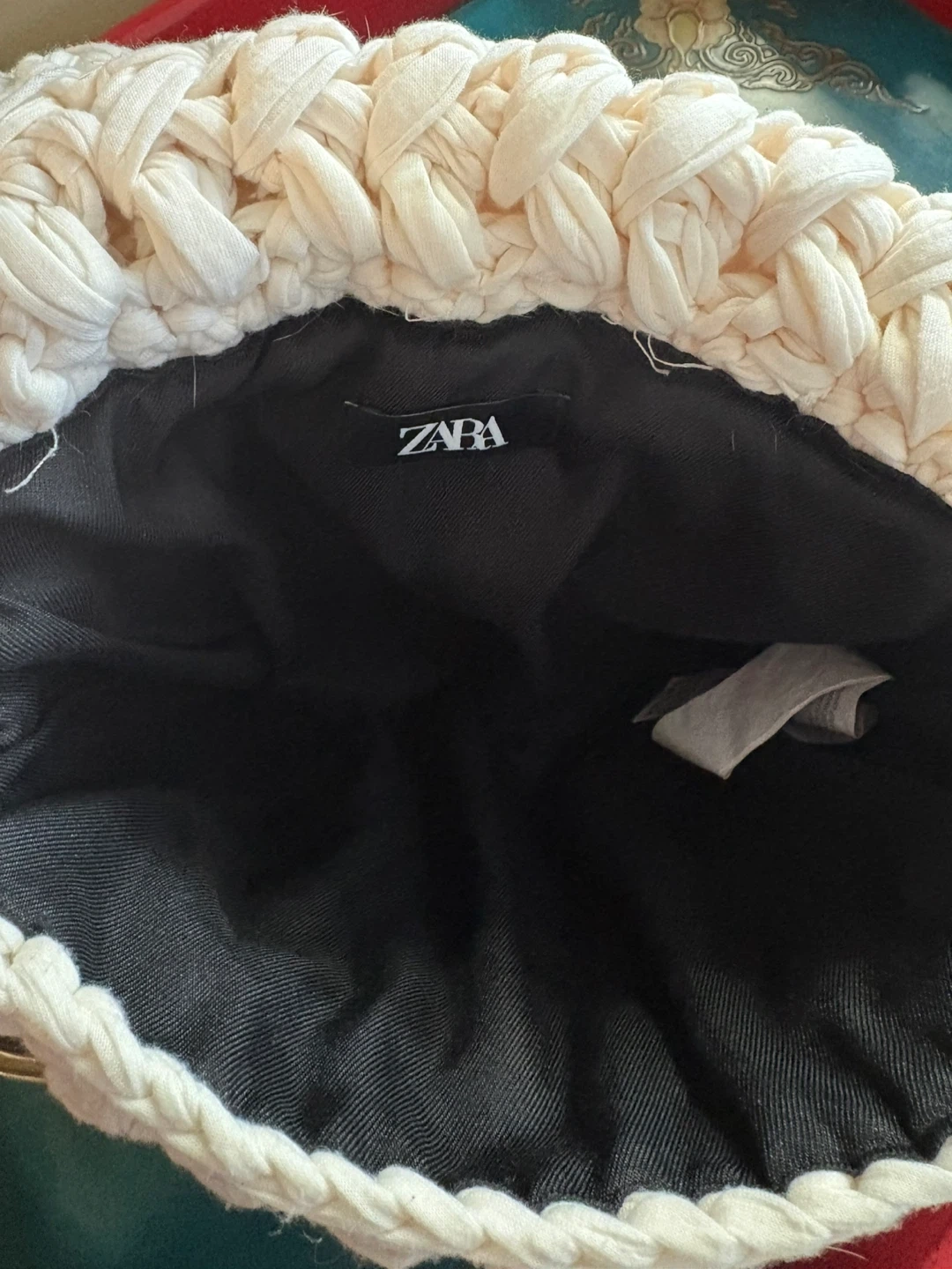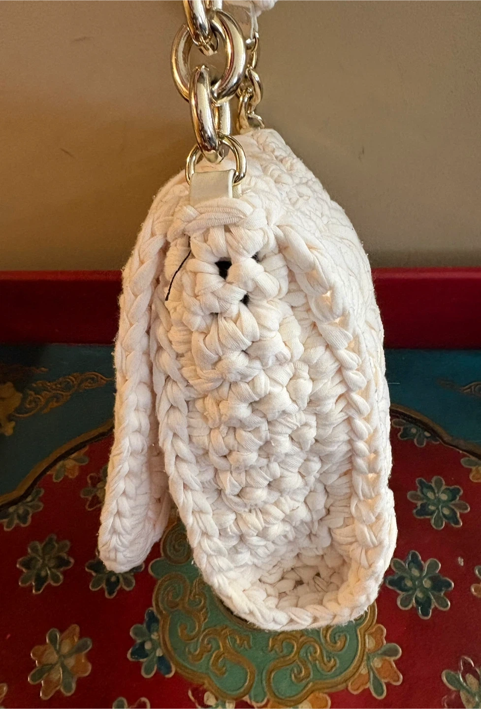Zara white shoulder bag with a crocheted texture and gold chain detail. It features a flap closure with a snap button. This bag is a great accessory for casual outings! Really original and unique design! Great condition, includes an adjustable strap. Pick up in Chestermere.