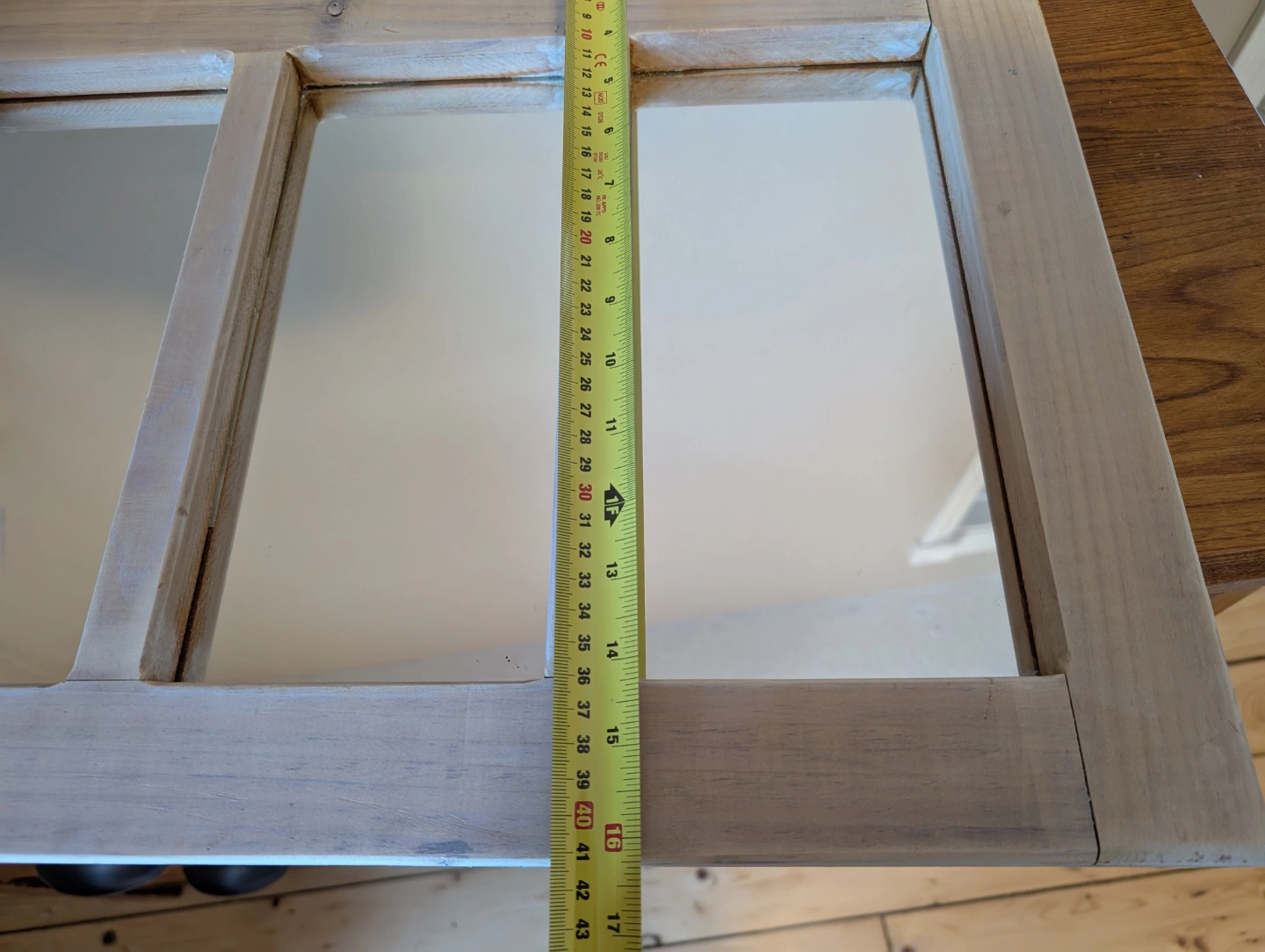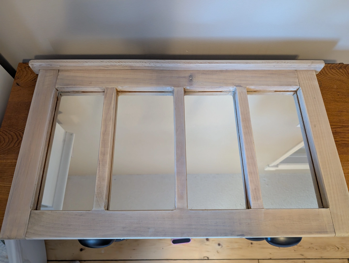 Beautiful wooden framed mirror. Four panels. Light white finish.
