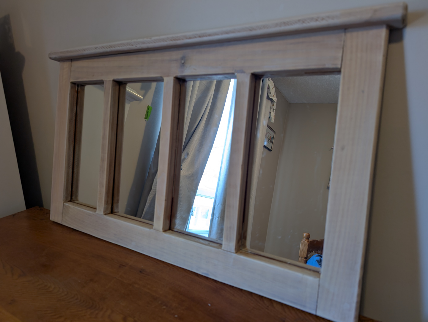 Beautiful wooden framed mirror. Four panels. Light white finish.
