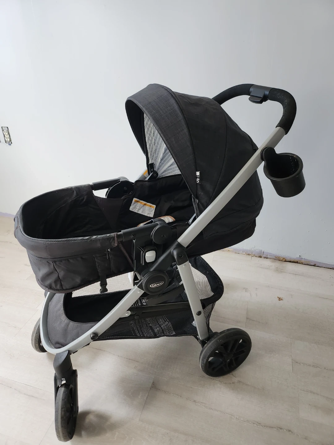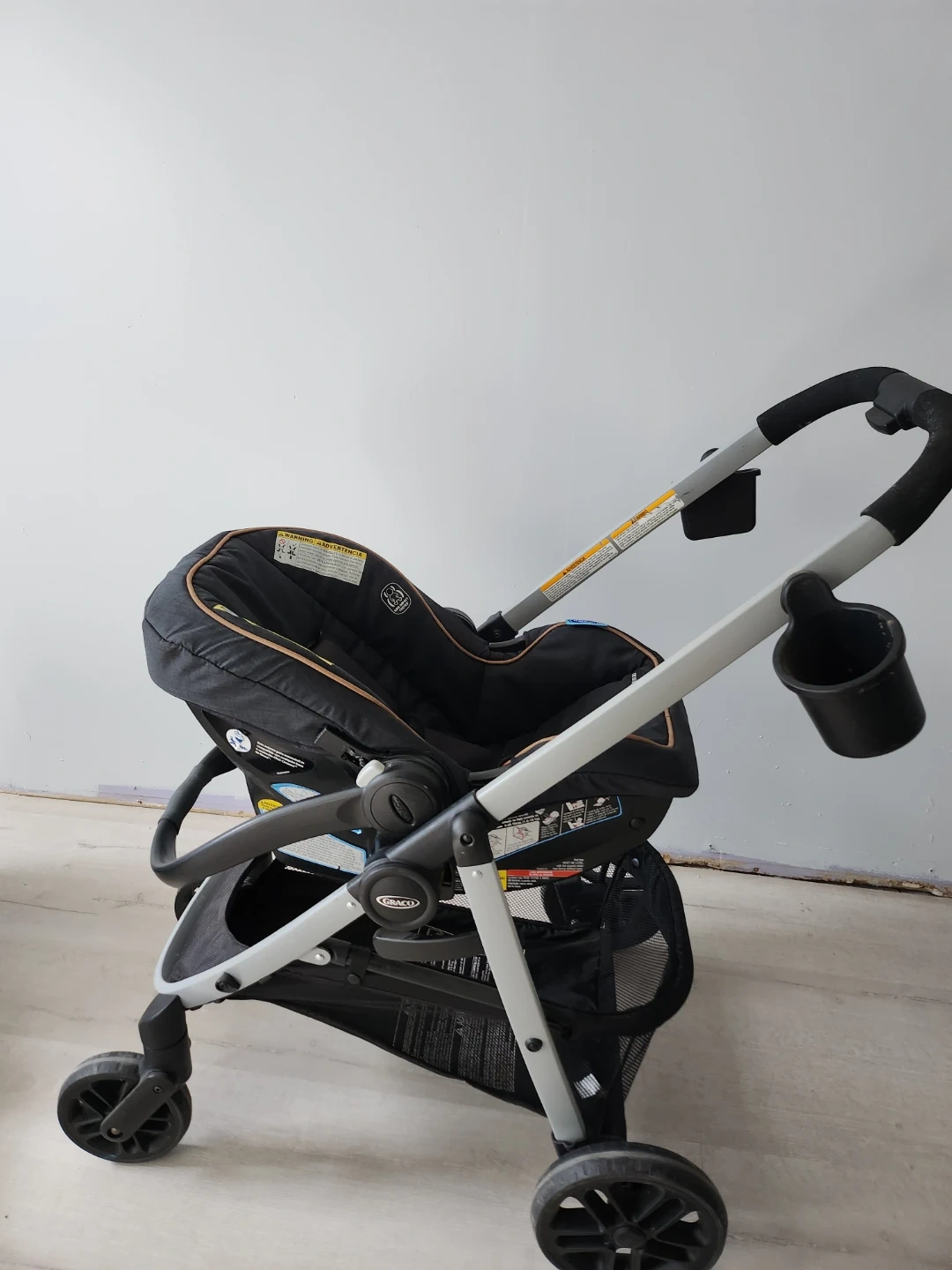 This Graco travel system includes a stroller and a car seat. It's a convenient setup for transporting little ones. The stroller features a basket for storage. The car seat attaches securely. We used the car seat more than the stroller, we used the stroller when we traveled.