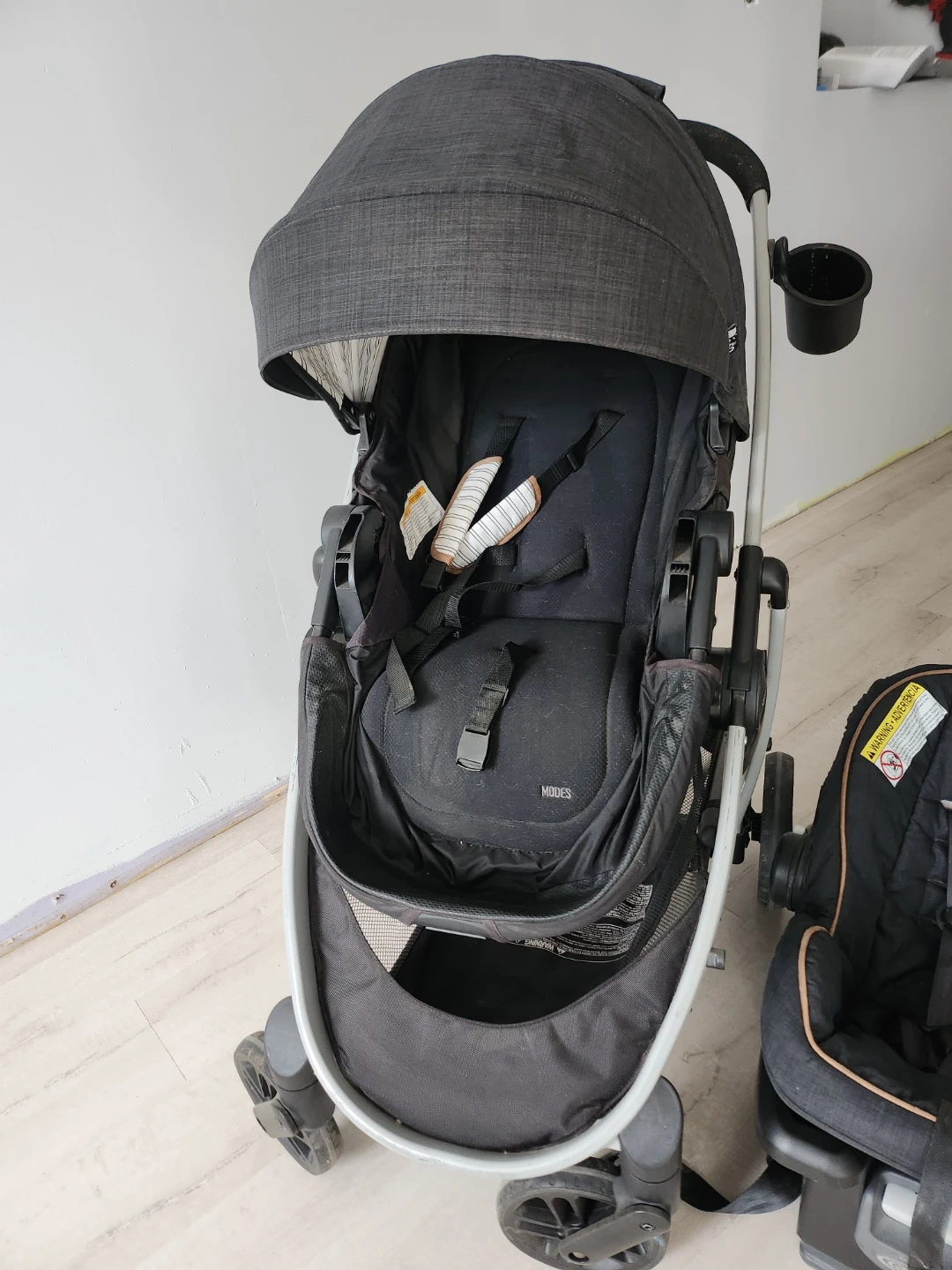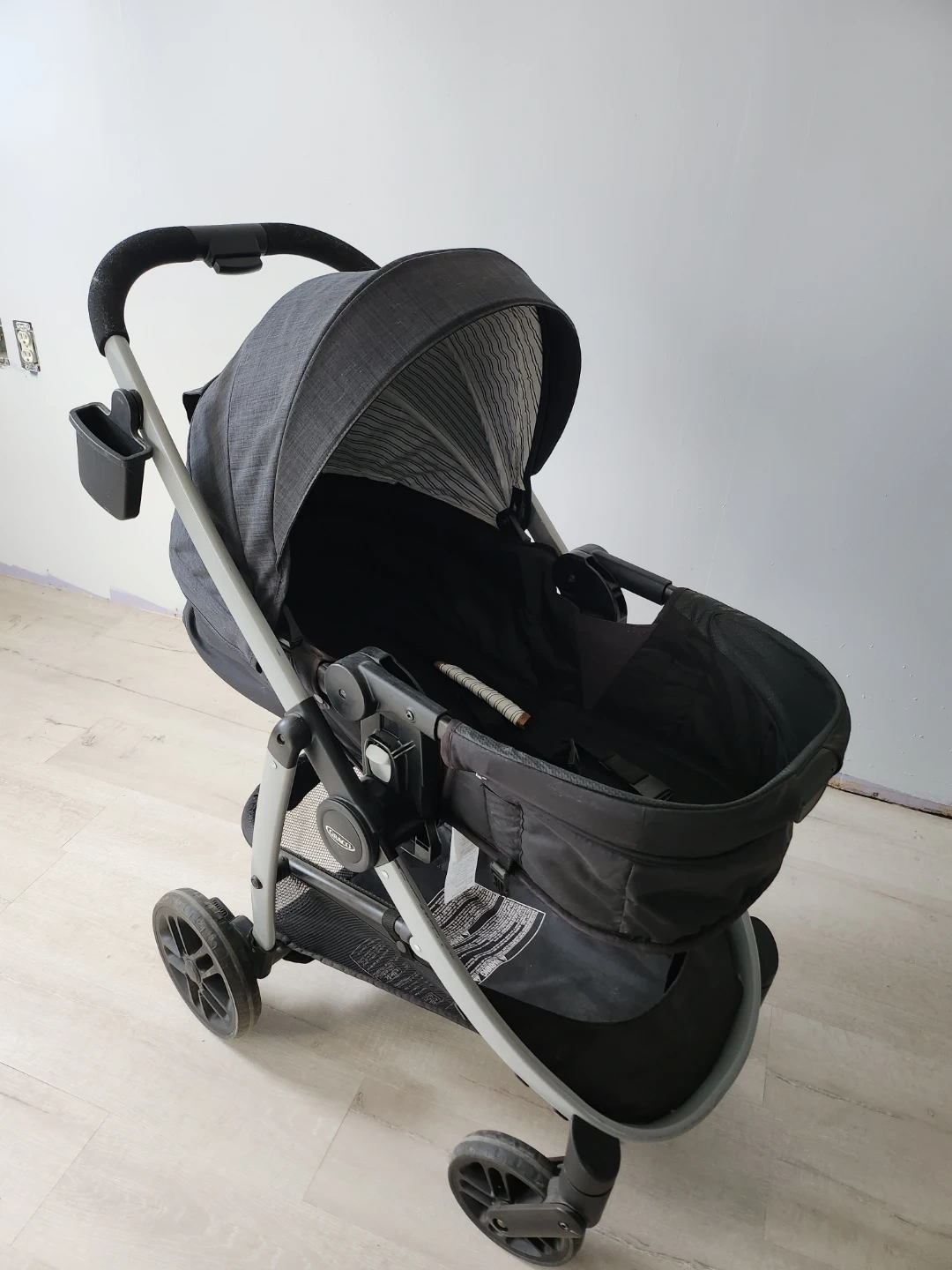 This Graco travel system includes a stroller and a car seat. It's a convenient setup for transporting little ones. The stroller features a basket for storage. The car seat attaches securely. We used the car seat more than the stroller, we used the stroller when we traveled.