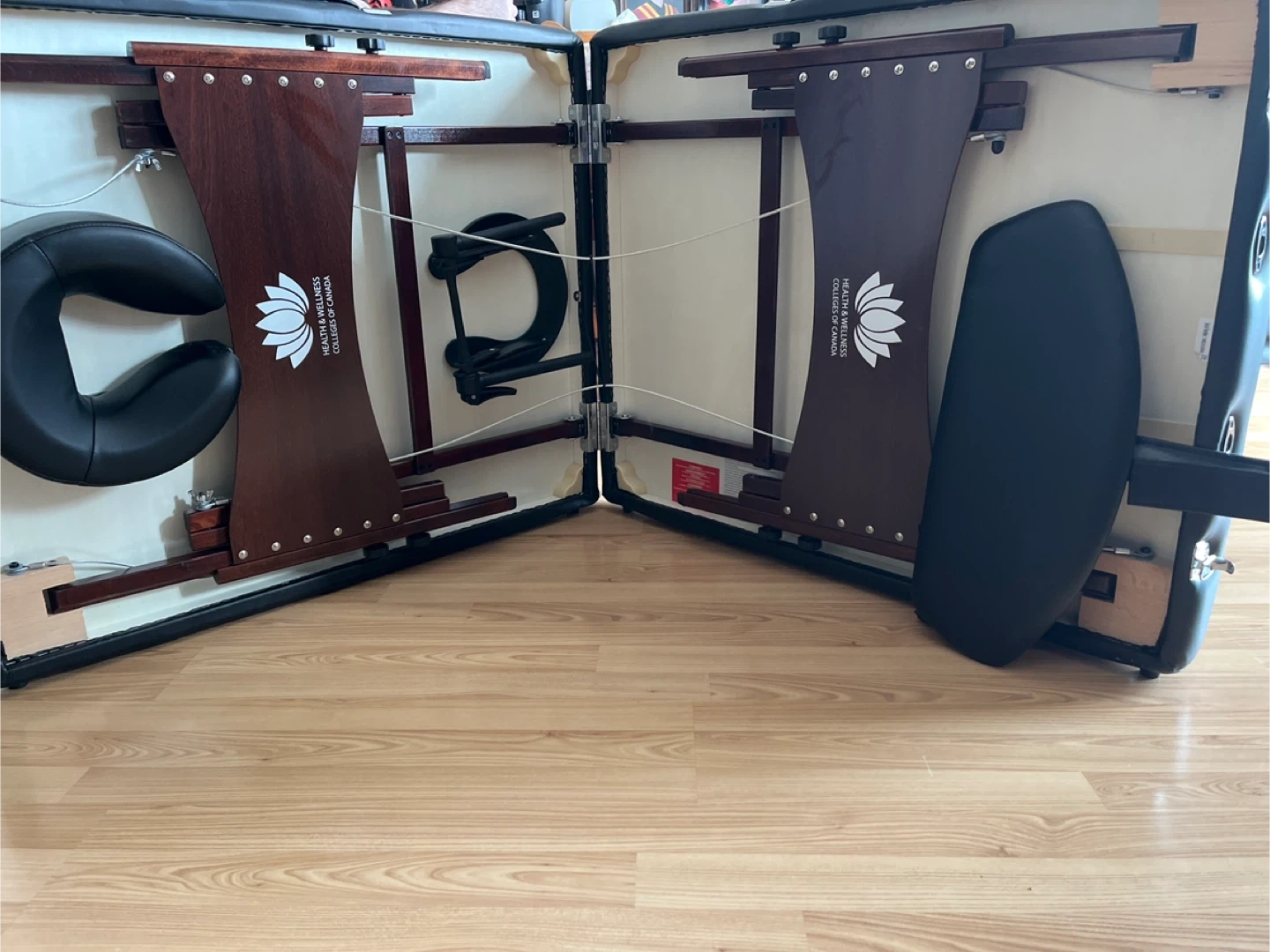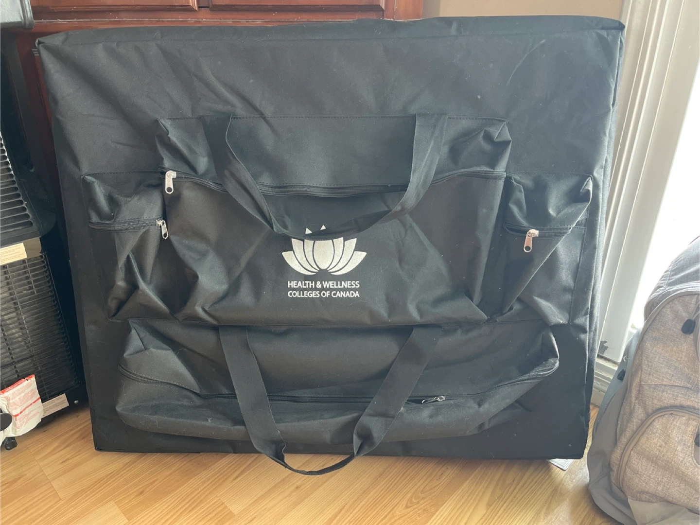 This portable massage table is from Health & Wellness Colleges of Canada. It's black and comes with a carrying bag for easy transport. The table is brand new includes a headrest and arm rest. Can include fitted head rest cover, fitted sheets and blankets.