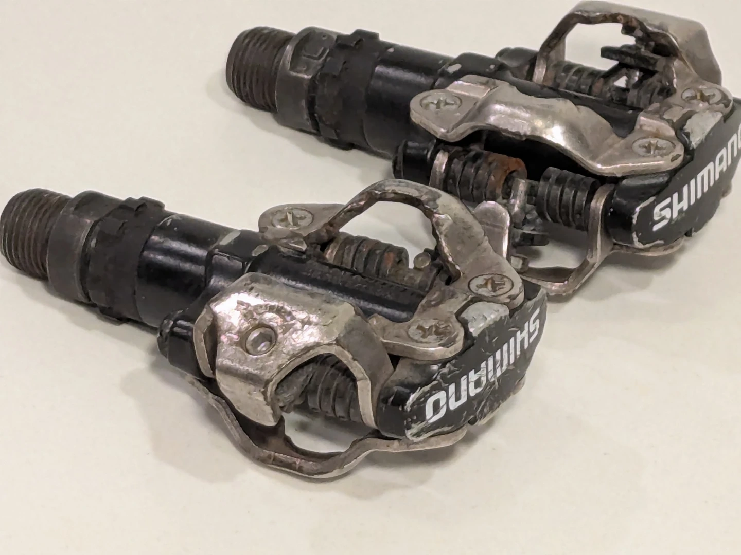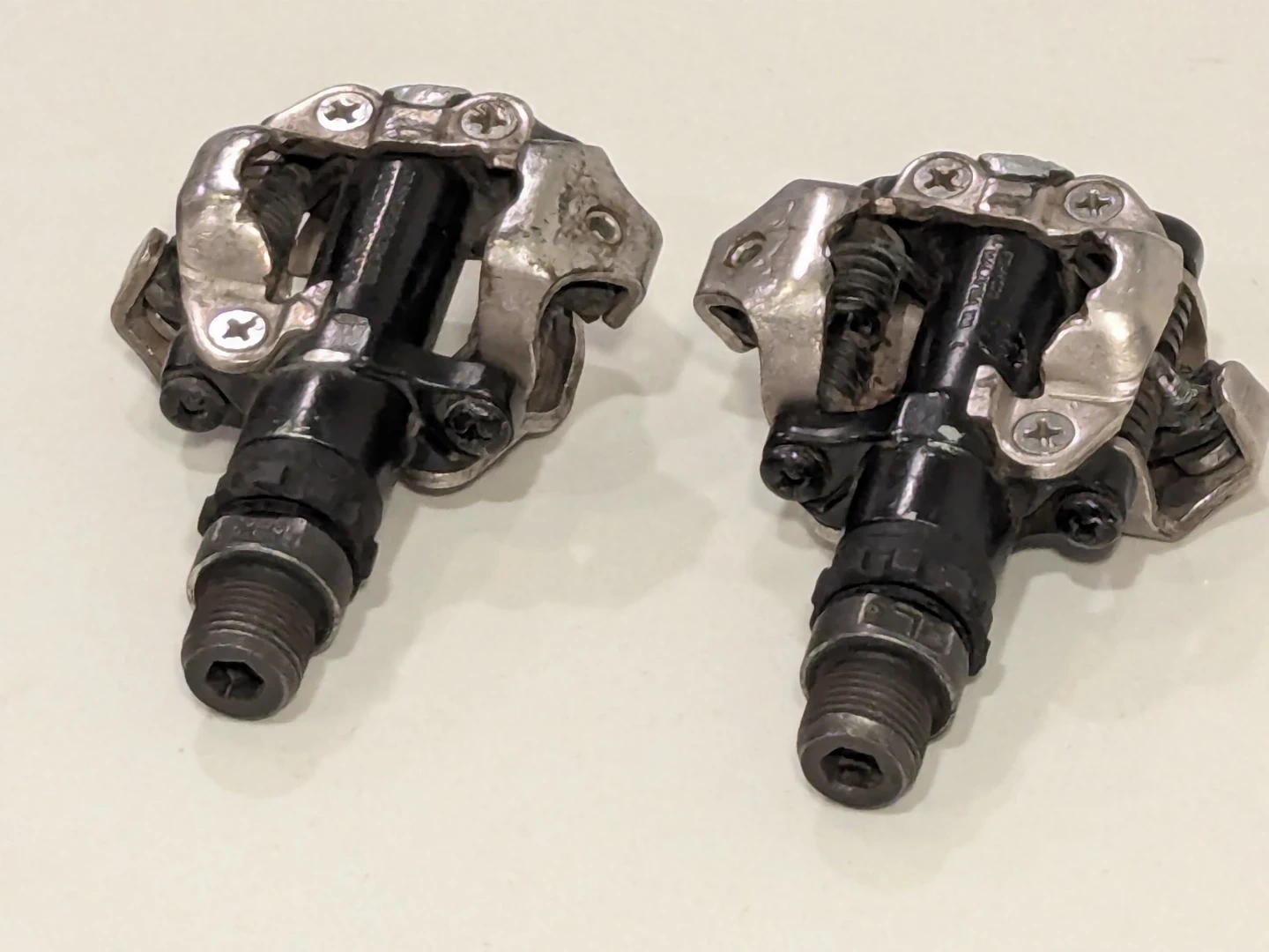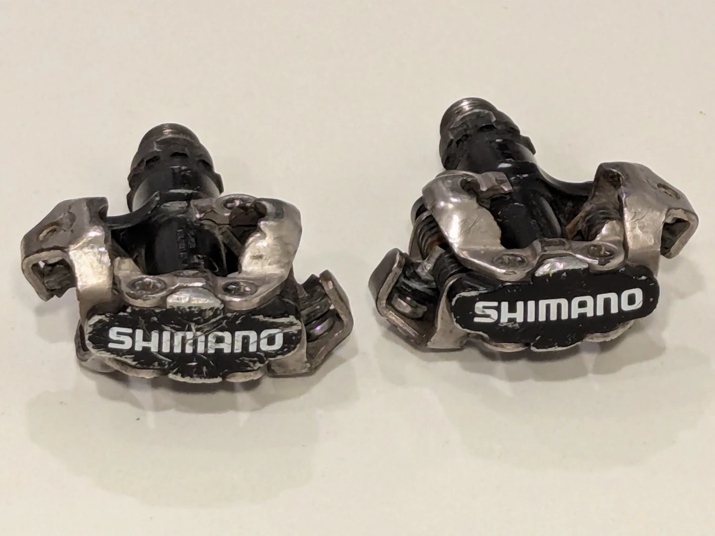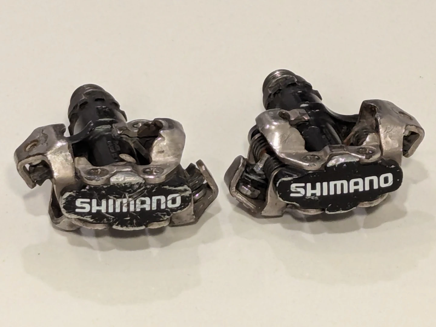 Pair of Shimano clipless SPD pedals. Model PD-M520. Double sided. These pedals are designed for cycling. They have a metal and black finish.