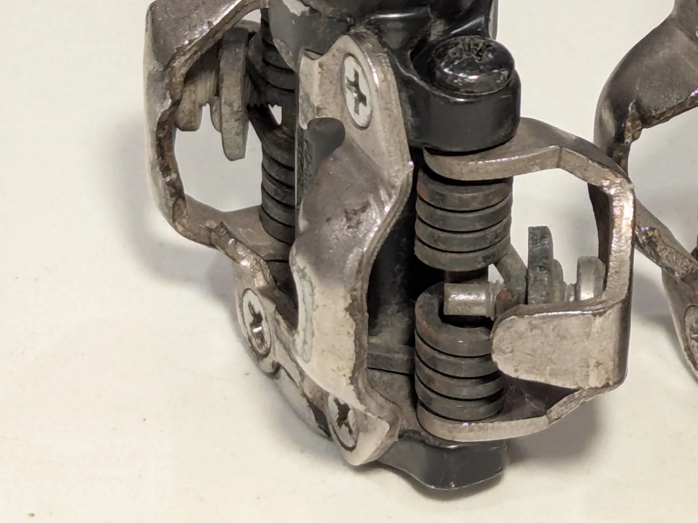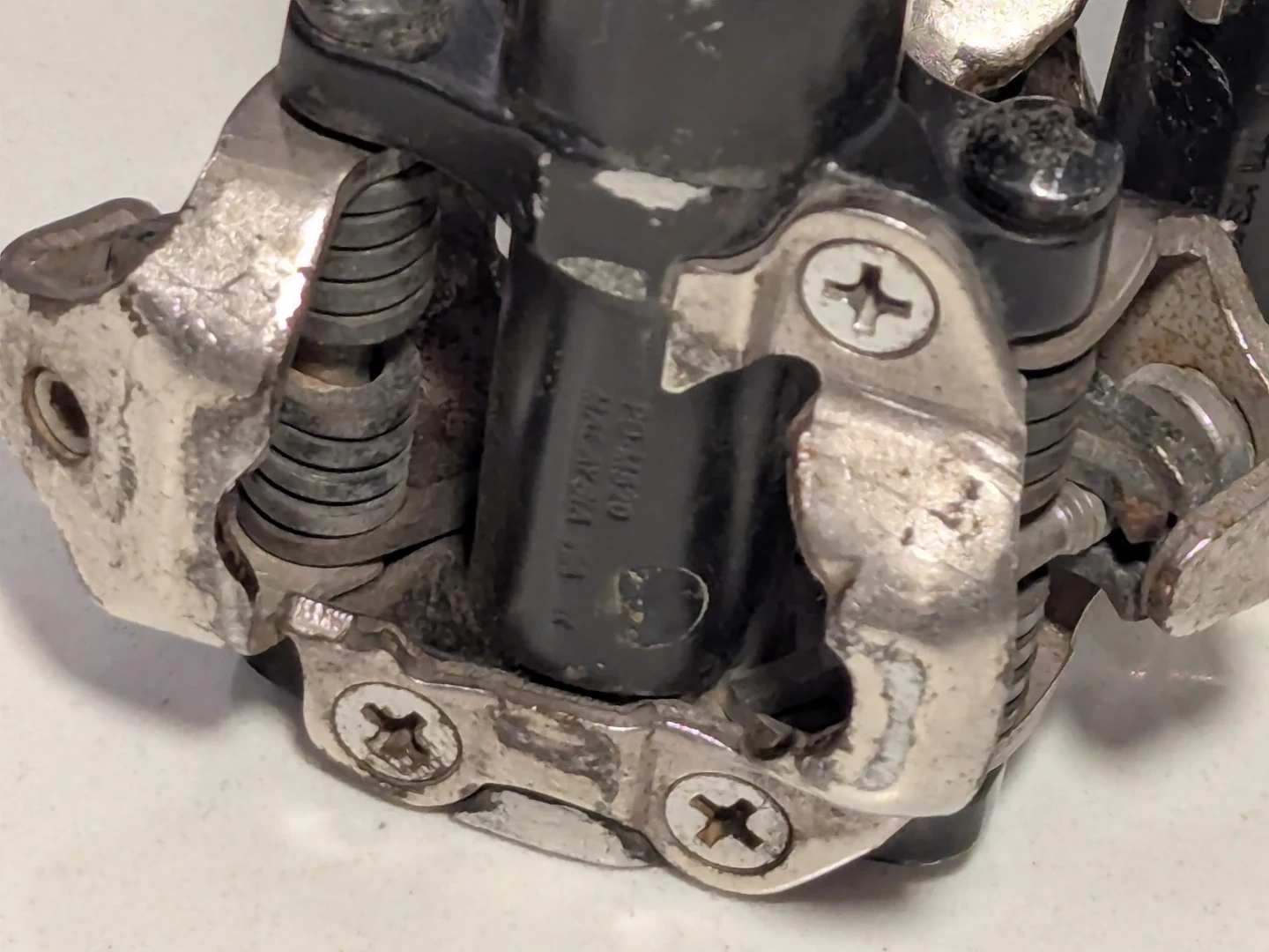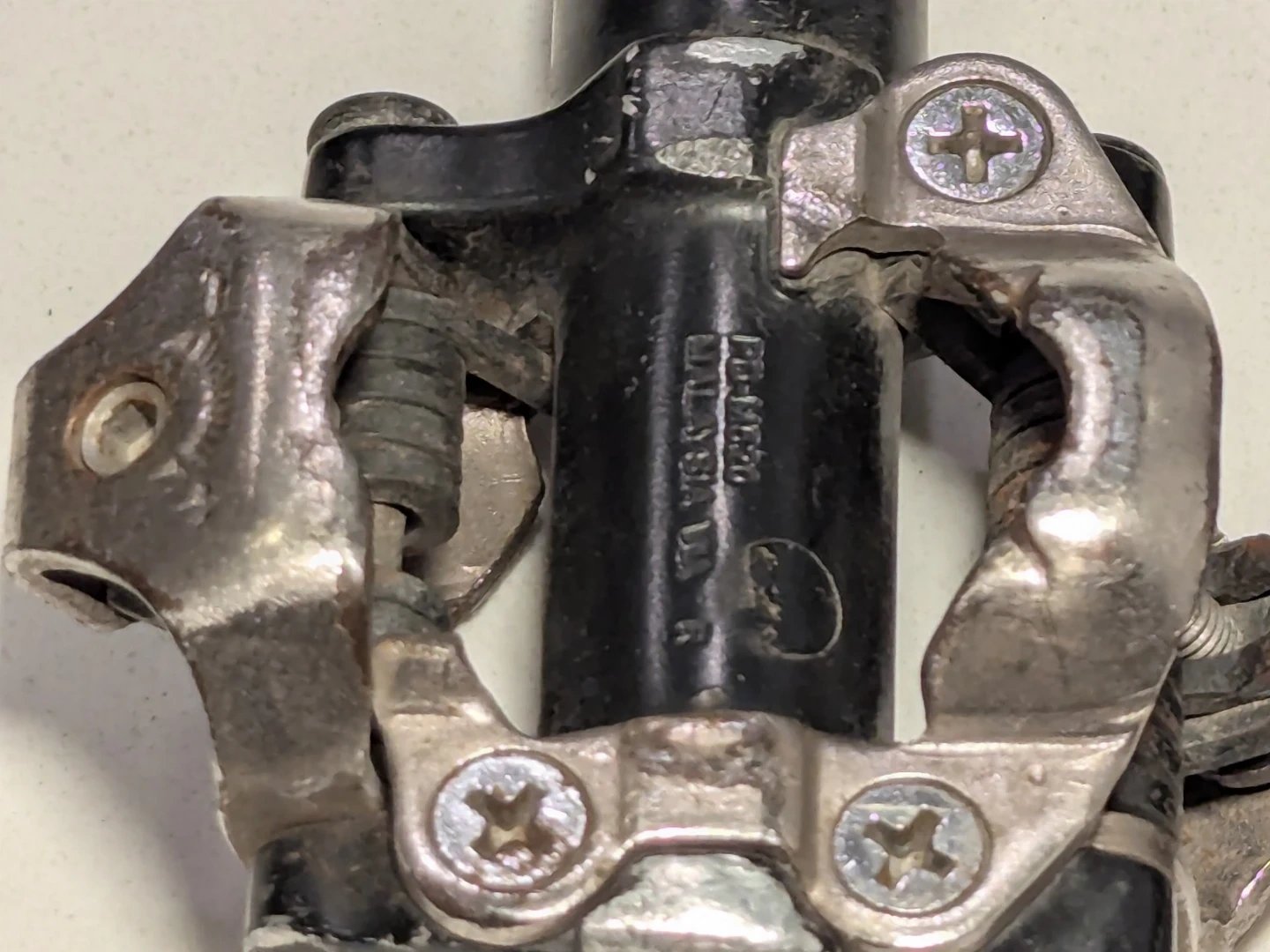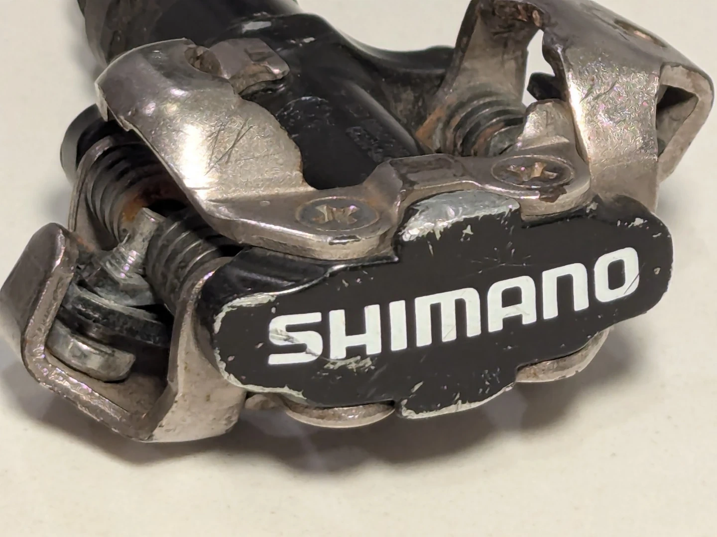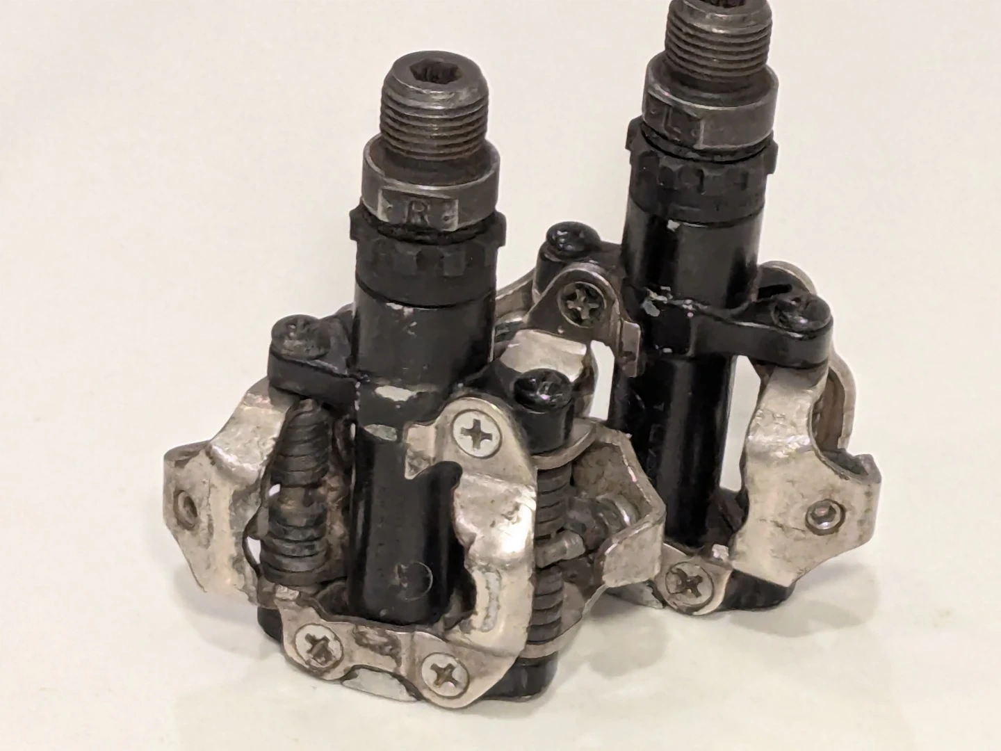 Pair of Shimano clipless SPD pedals. Model PD-M520. Double sided. These pedals are designed for cycling. They have a metal and black finish.
