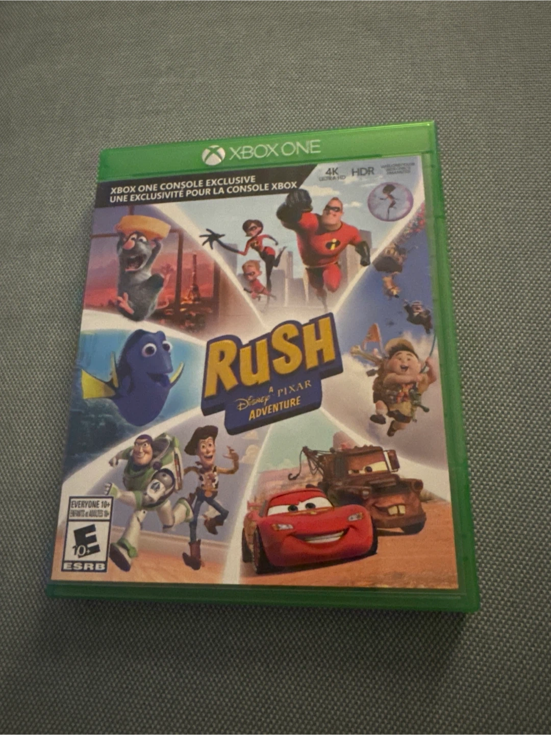 This game features characters from several Disney Pixar films. It's rated E for Everyone and supports 4K HDR. The disc and case are included.