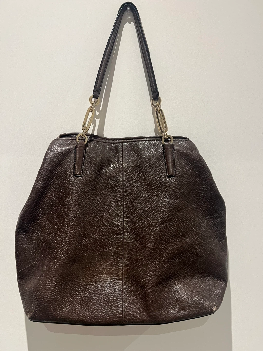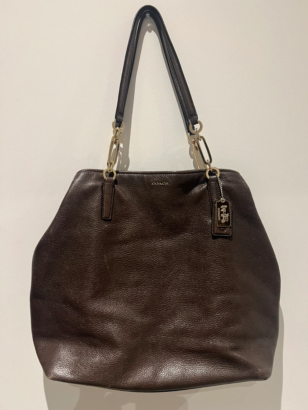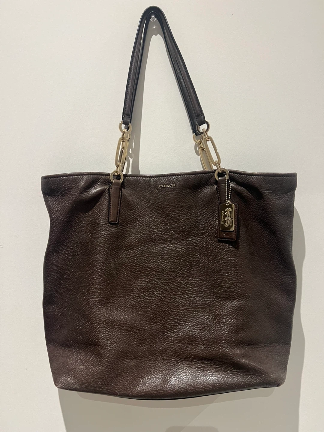 Selling a Coach tote bag in a lovely brown leather. It's in great condition and ready for a new home! The bag features gold chain detailing on the straps.