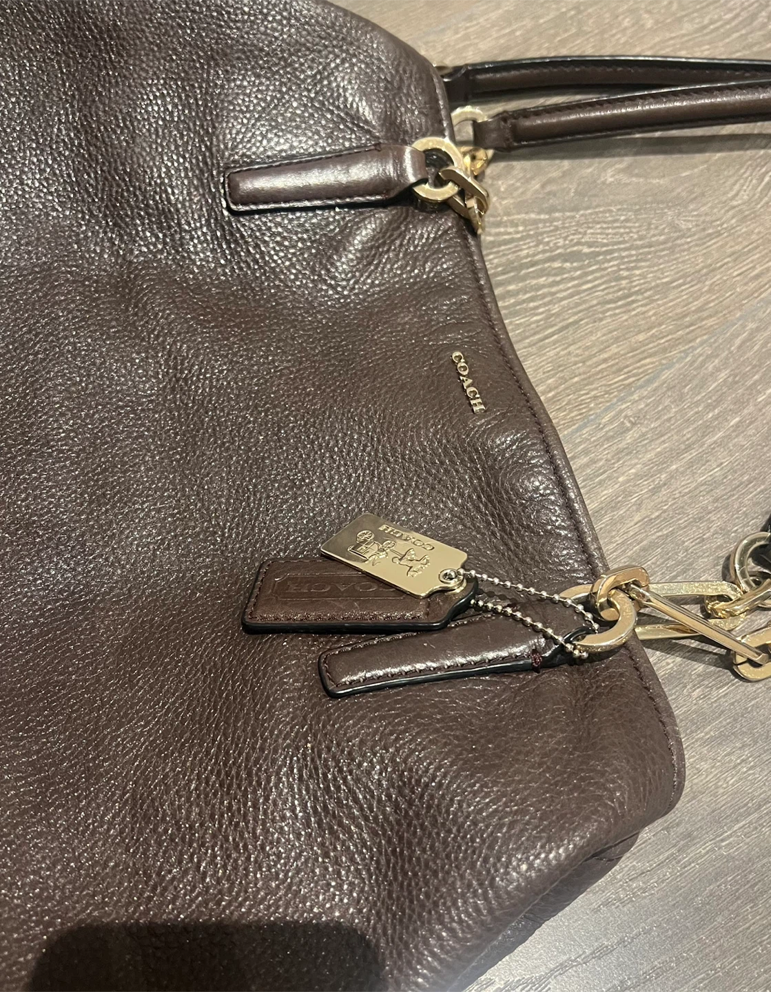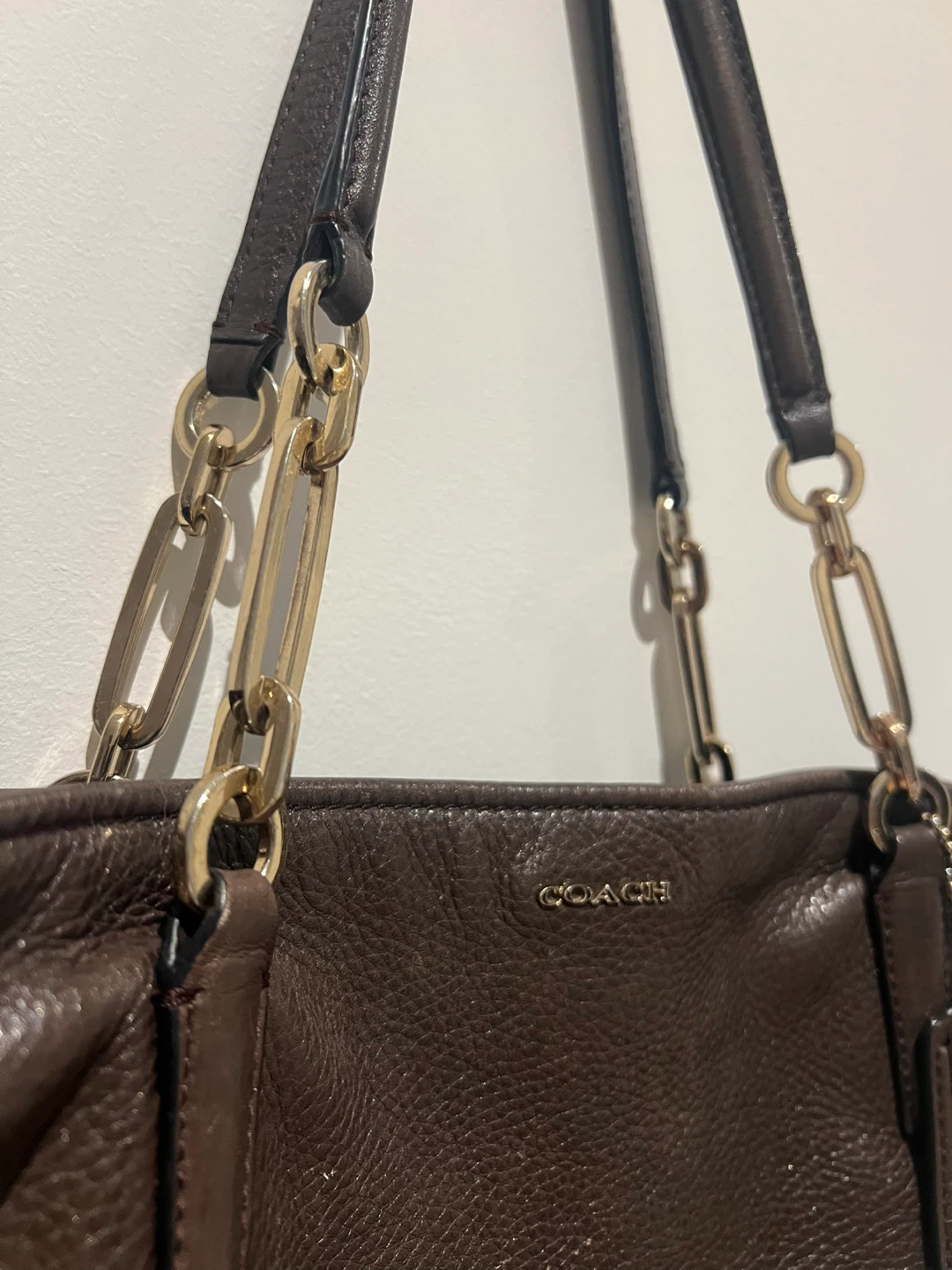Selling a Coach tote bag in a lovely brown leather. It's in great condition and ready for a new home! The bag features gold chain detailing on the straps.