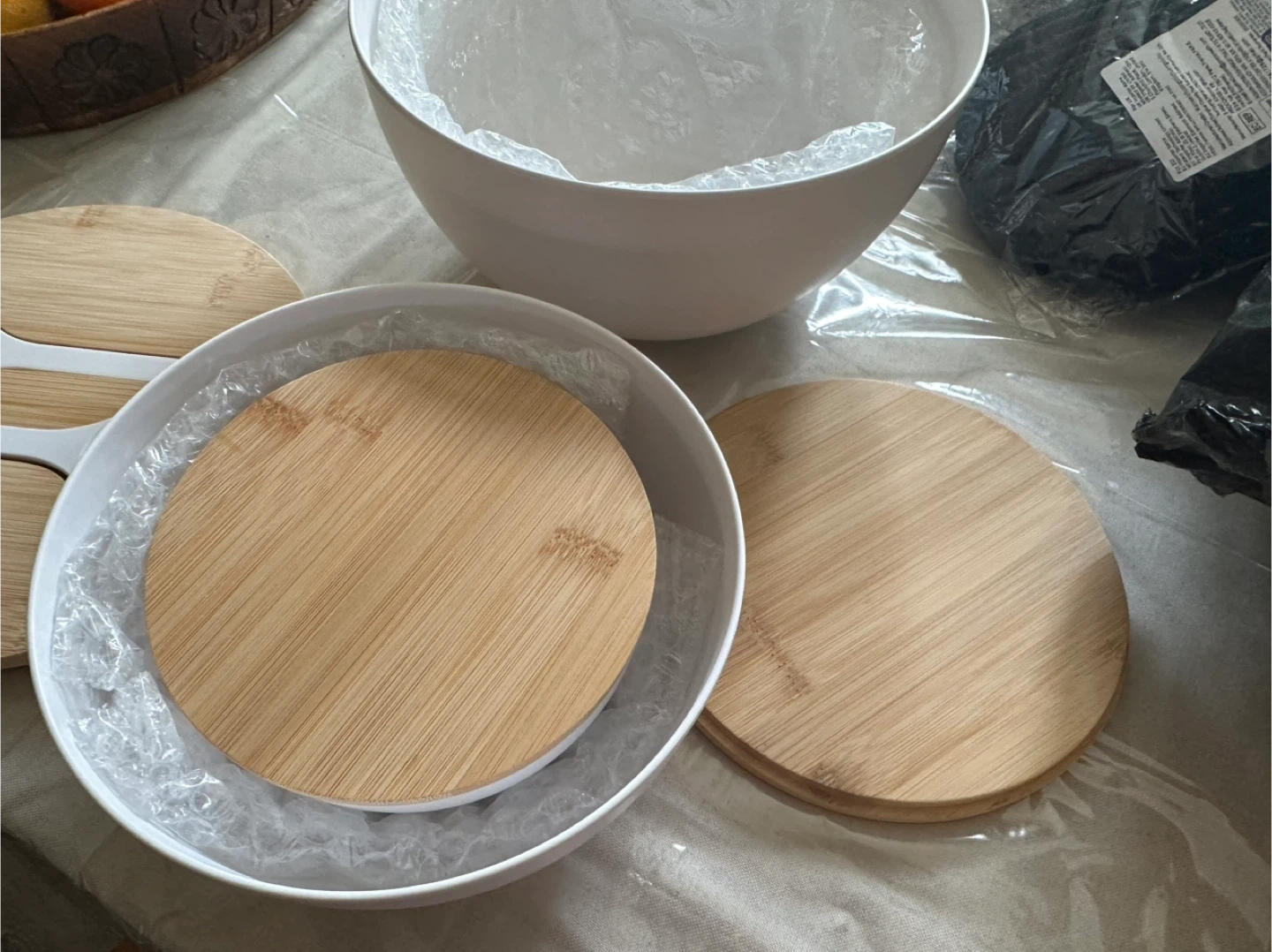 Set of 3 mixing bowls made from bamboo fiber with bamboo lids. Includes serving utensils. The largest bowl has a diameter of 9.80 inches. These bowls are great for serving salads or storing food. Brand new but no box. Pick up near the border of Brampton and Caledon. Mayfield and Kennedy