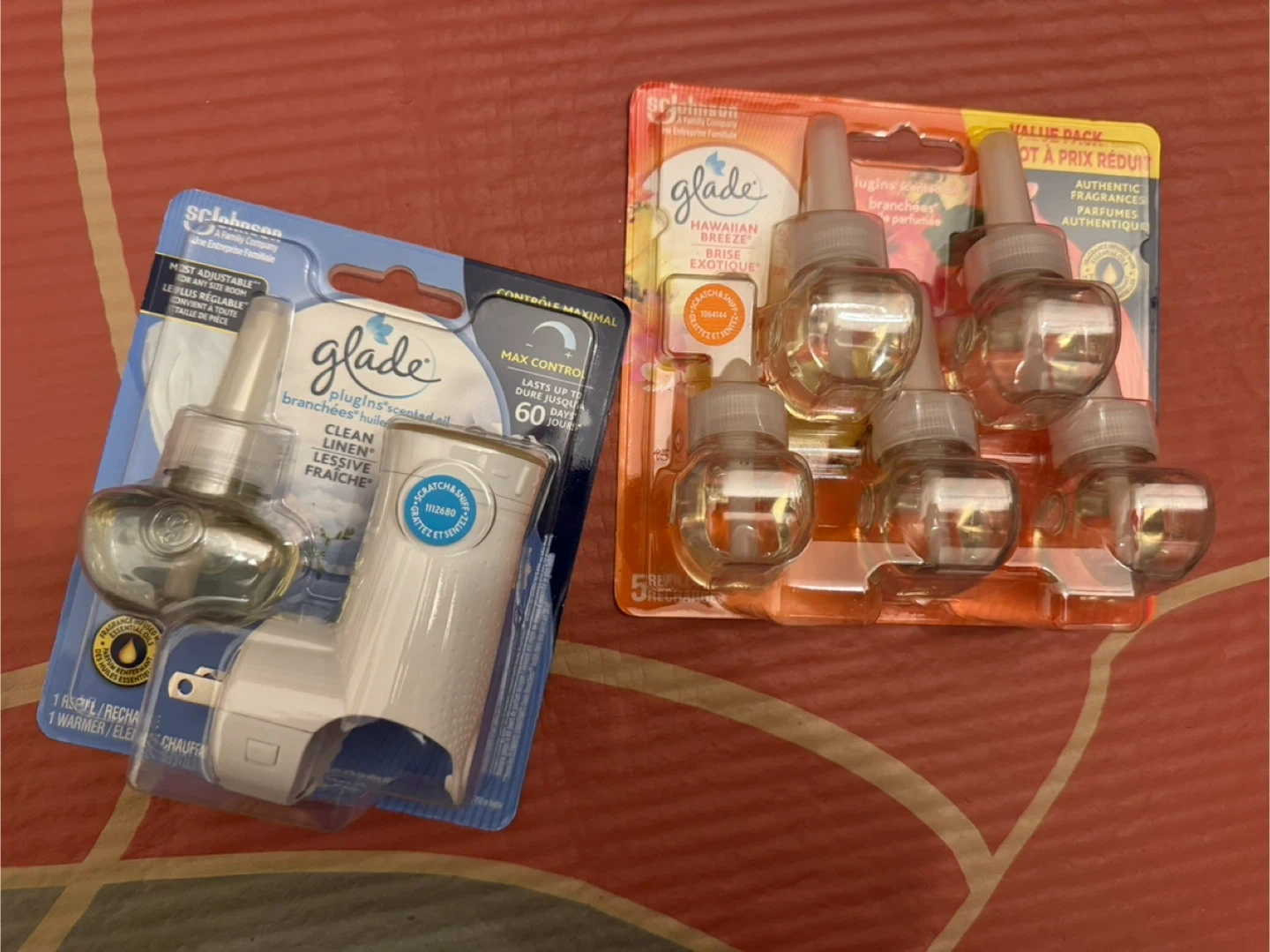 Two packs of Glade Plugins scented oil refills are available. One pack contains Clean Linen scent with a warmer and lasts up to 60 days. The other pack is a value pack with 5 Hawaiian Breeze refills. These provide continuous fragrance control for any room.