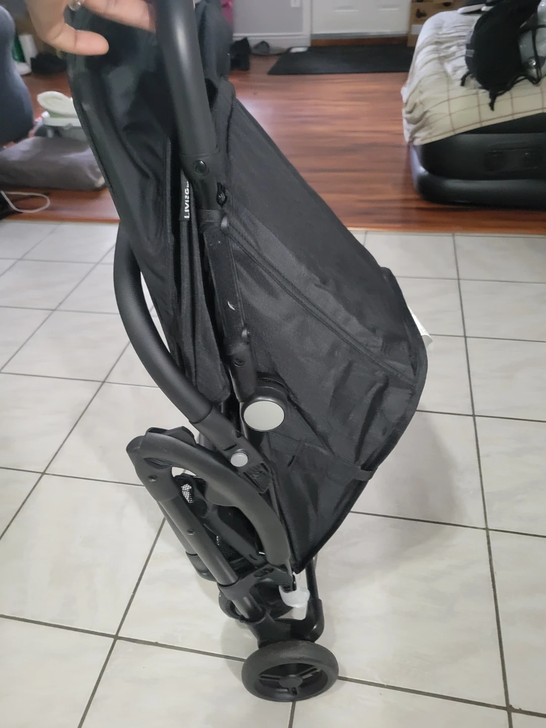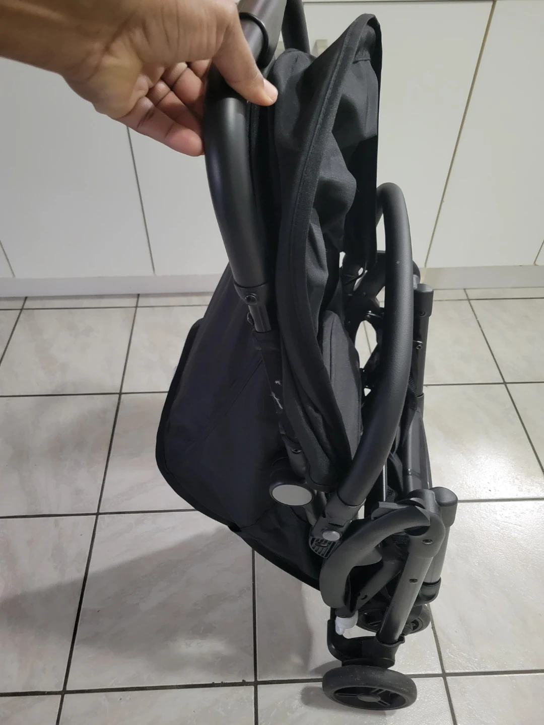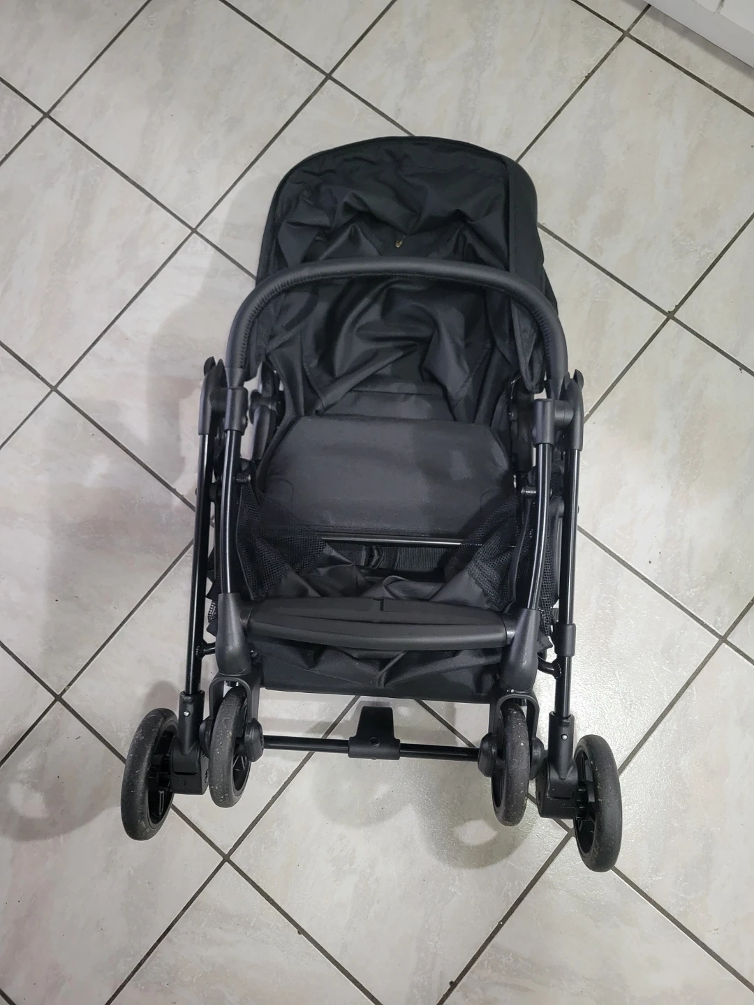 This black stroller is lightweight and easy to fold for travel. It features a secure harness and a storage basket underneath. This stroller is great for on-the-go parents!