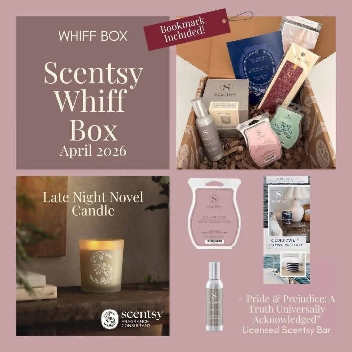 This Scentsy Whiff Box is from April 2026. It includes a variety of Scentsy products like wax melts, a room spray, and a candle. A bookmark is also included!