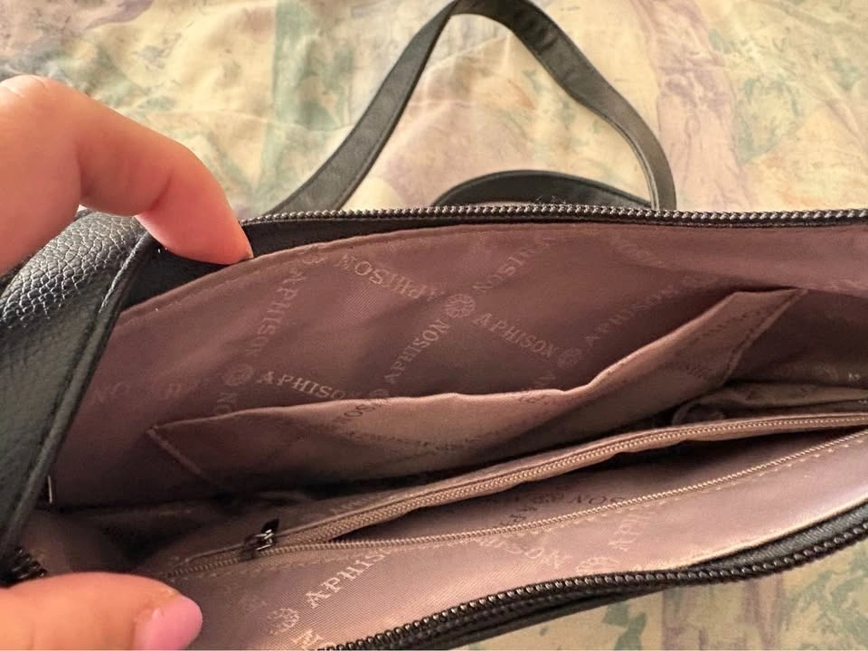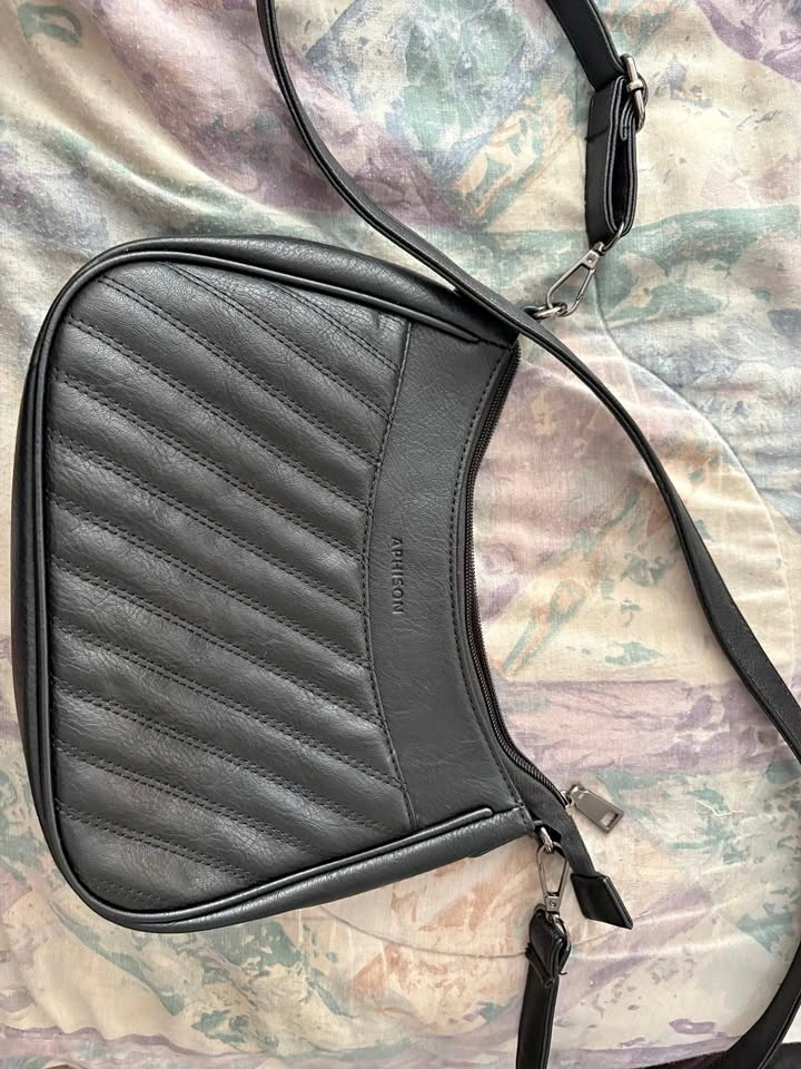 Stylish black quilted crossbody bag by APHISON. Has adjustable strap and zip closure. Measures about 26 cm long and 17 cm high. Great for everyday use. Pickup/ Cash only. SE Vancouver. Victoria Drive & E 61 Ave. Look at my other listings too.