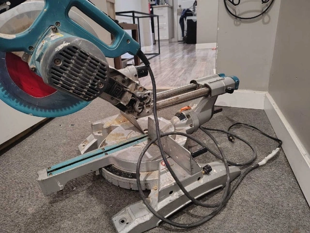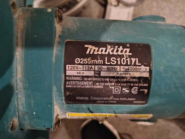 This Makita LS1017L 10" sliding dual bevel miter saw is in working order and comes with a like-new Diablo saw blade. It could use a good greasing and a few other minor things. It's missing the dust bag and side gates, and the laser cut line needs 2 AA batteries to work. Otherwise, it's a nice saw. Feel free to message if you have any questions.