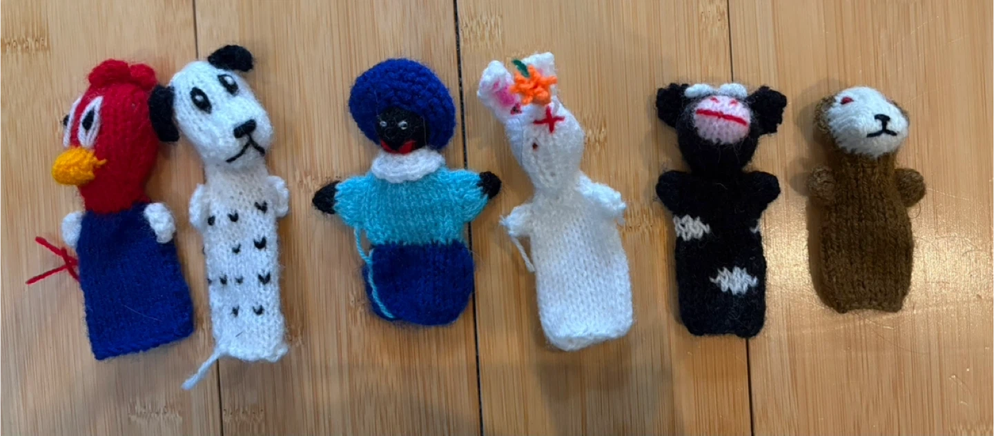 Set of six unique hand-knitted finger puppets. Includes a chicken, dalmatian dog, person, bunny, cow, and bear. Made from yarn.