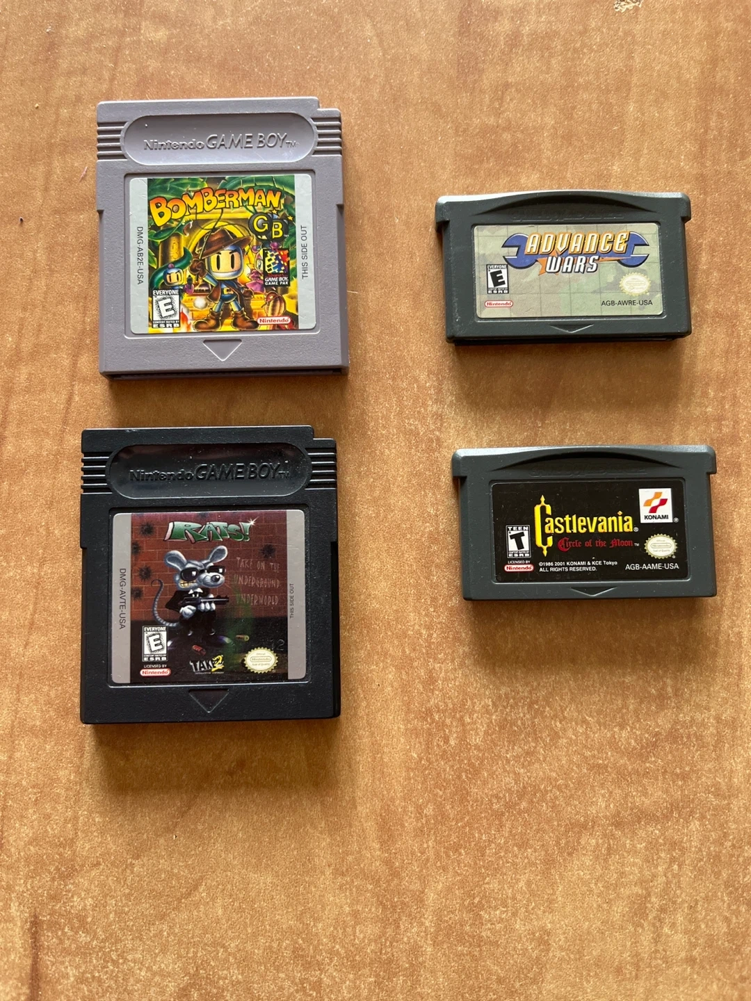 Bundle of four video games: Bomberman, Rats!, Advance Wars, and Castlevania: Circle of the Moon. These cartridges are for Nintendo Game Boy and Game Boy Advance systems.