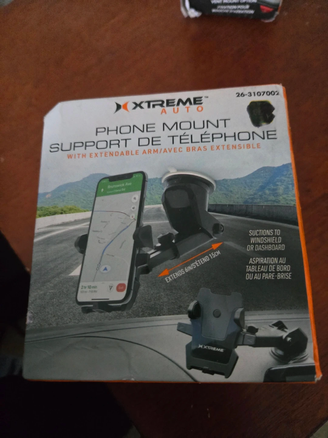 Selling an Xtreme Auto phone mount with an extendable arm. It can be mounted to the windshield or dashboard using suction. The arm extends 6in/15cm. Comes with the original box