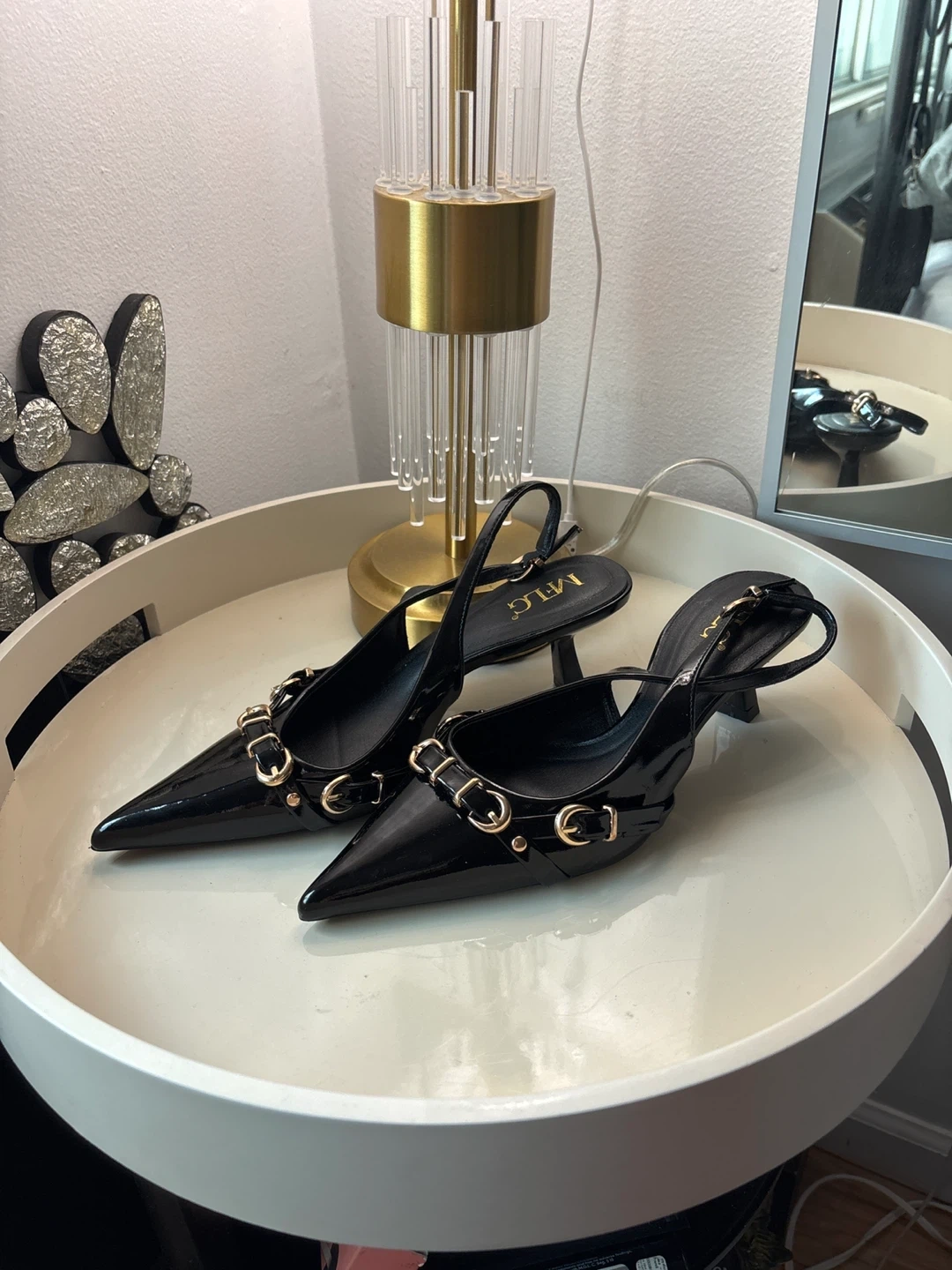 Selling a pair of MALC black heels in EU size 39.5, which is equivalent to a US size 9.5/10. These stylish heels feature a sleek design with gold-tone hardware. Perfect for a night out!