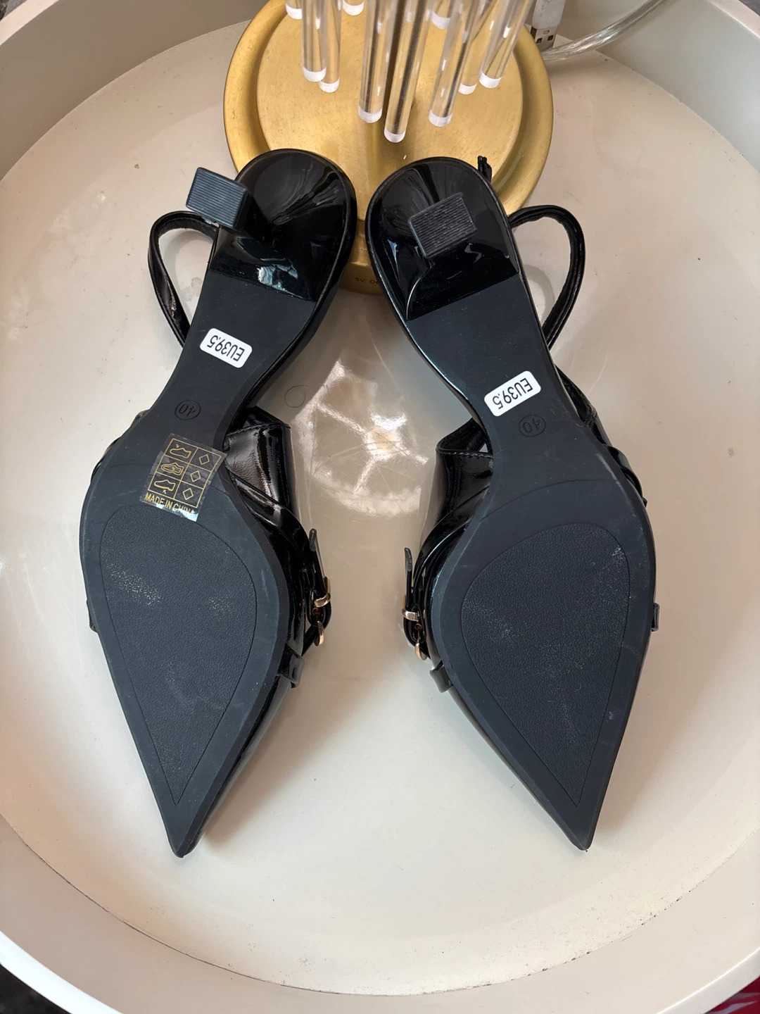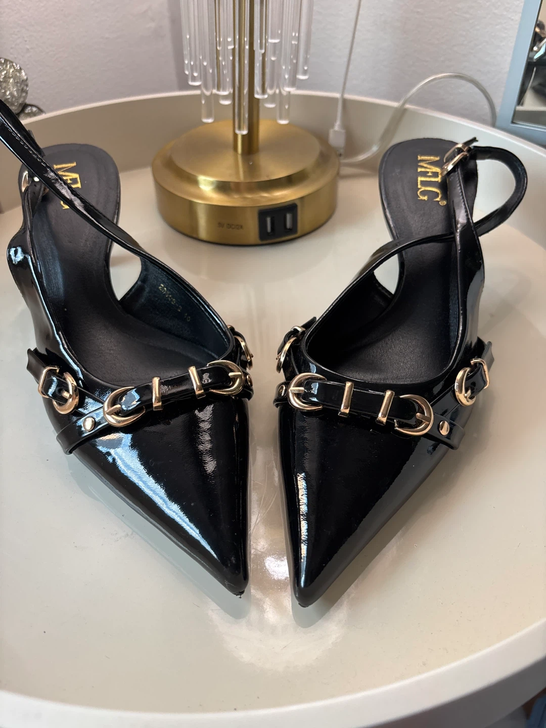 Selling a pair of MALC black heels in EU size 39.5, which is equivalent to a US size 9.5/10. These stylish heels feature a sleek design with gold-tone hardware. Perfect for a night out!