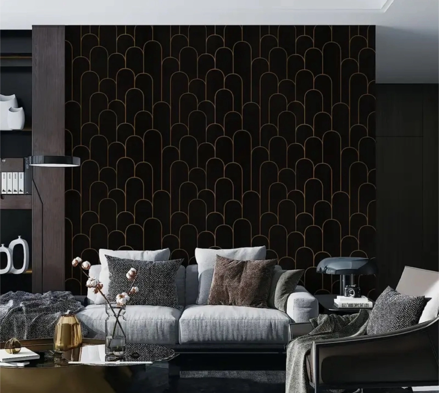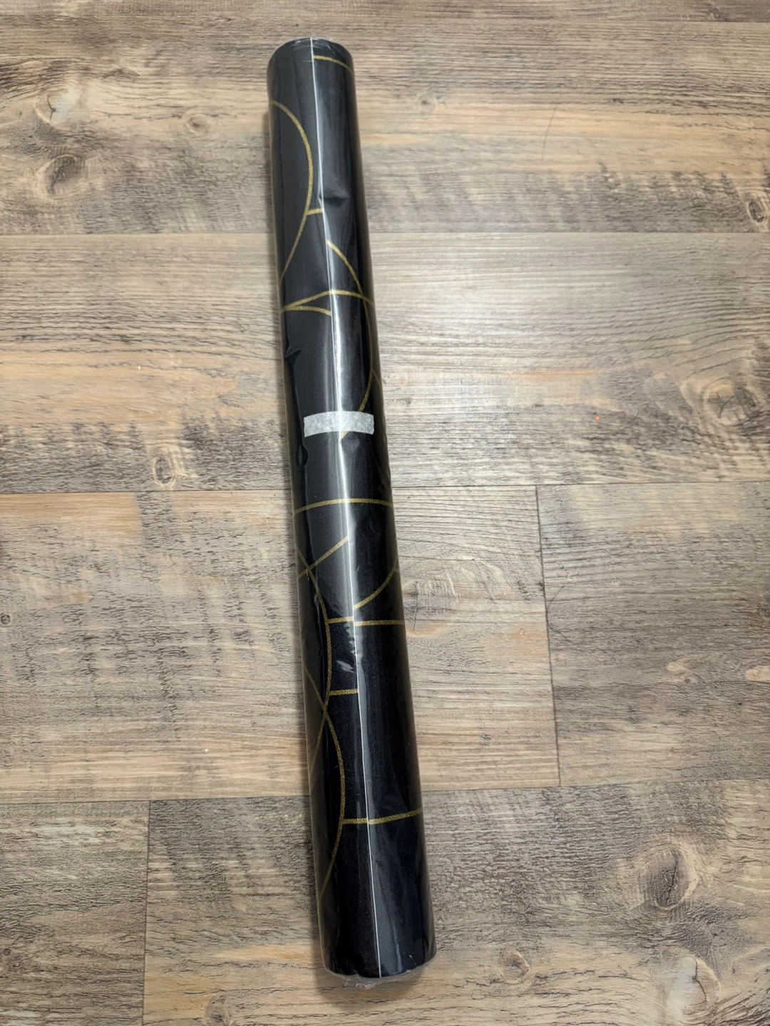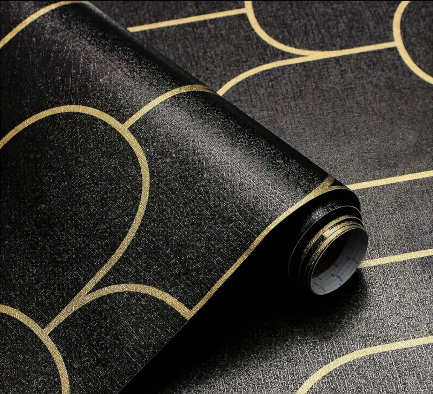 Elegant black wallpaper with gold geometric pattern. Self-adhesive. Perfect for accent wall. Unused new roll. Dimensions - 45cm x 500cm.