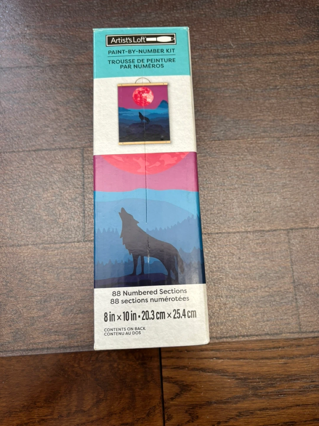 This is an Artist's Loft paint-by-number kit featuring a wolf howling at a large moon. It has 88 numbered sections. The finished artwork measures 8 in x 10 in (20.3 cm x 25.4 cm).