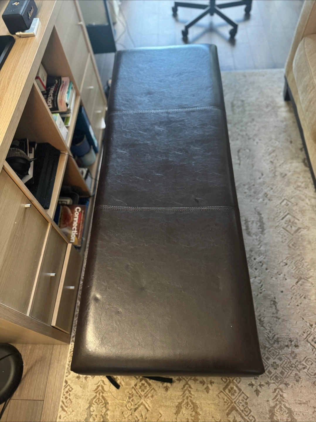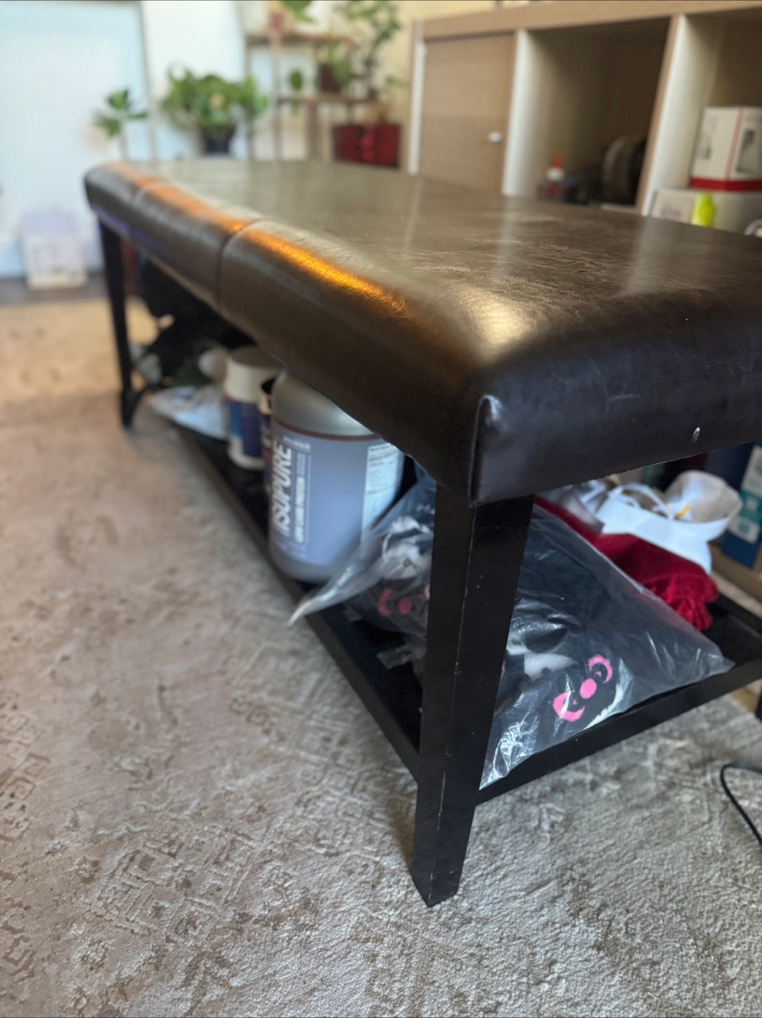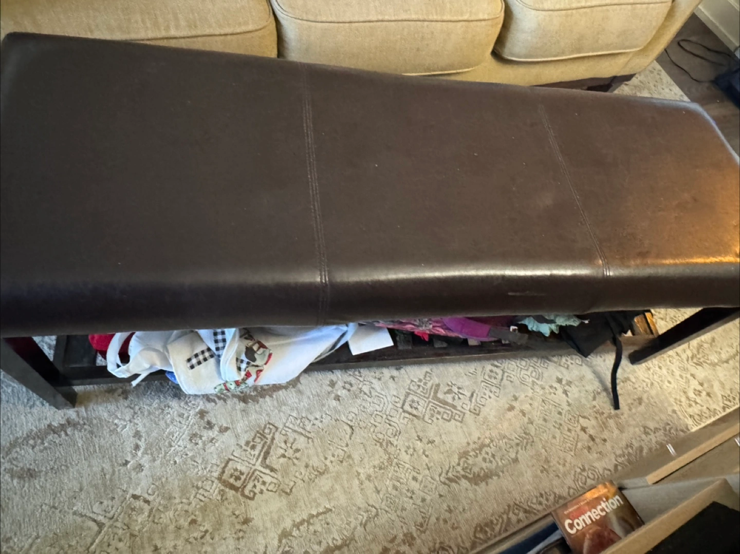 Selling a gently used brown faux leather bench. It has a shelf underneath for storage, perfect for organizing shoes or other items. It's sturdy and in good condition, with some minor signs of wear on the surface. Great for an entryway or living room!