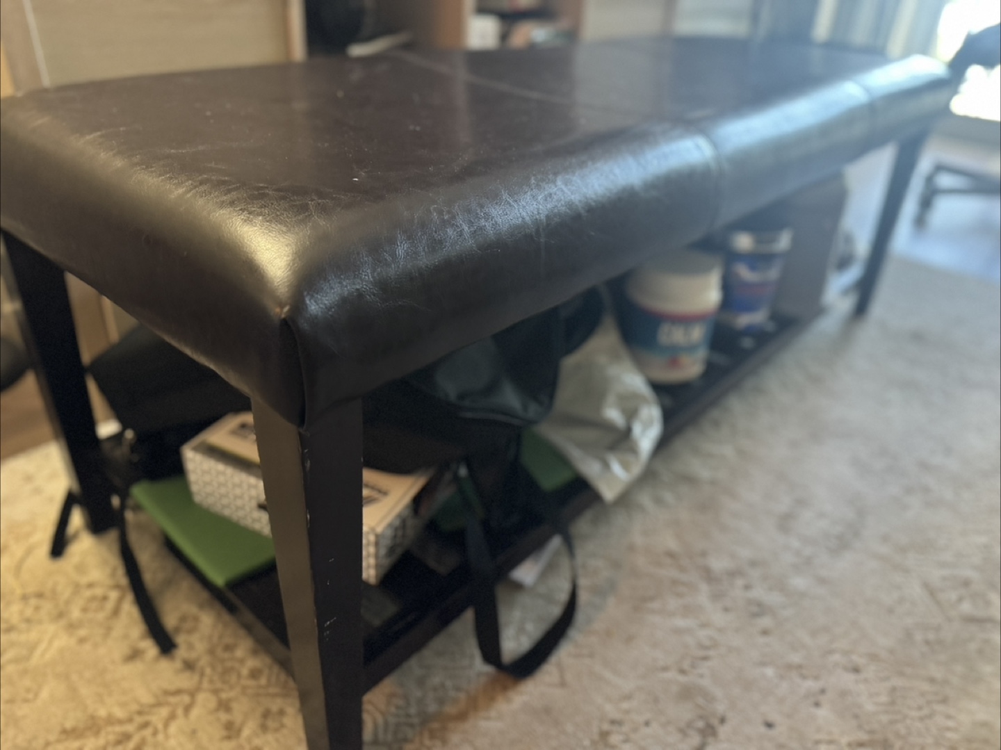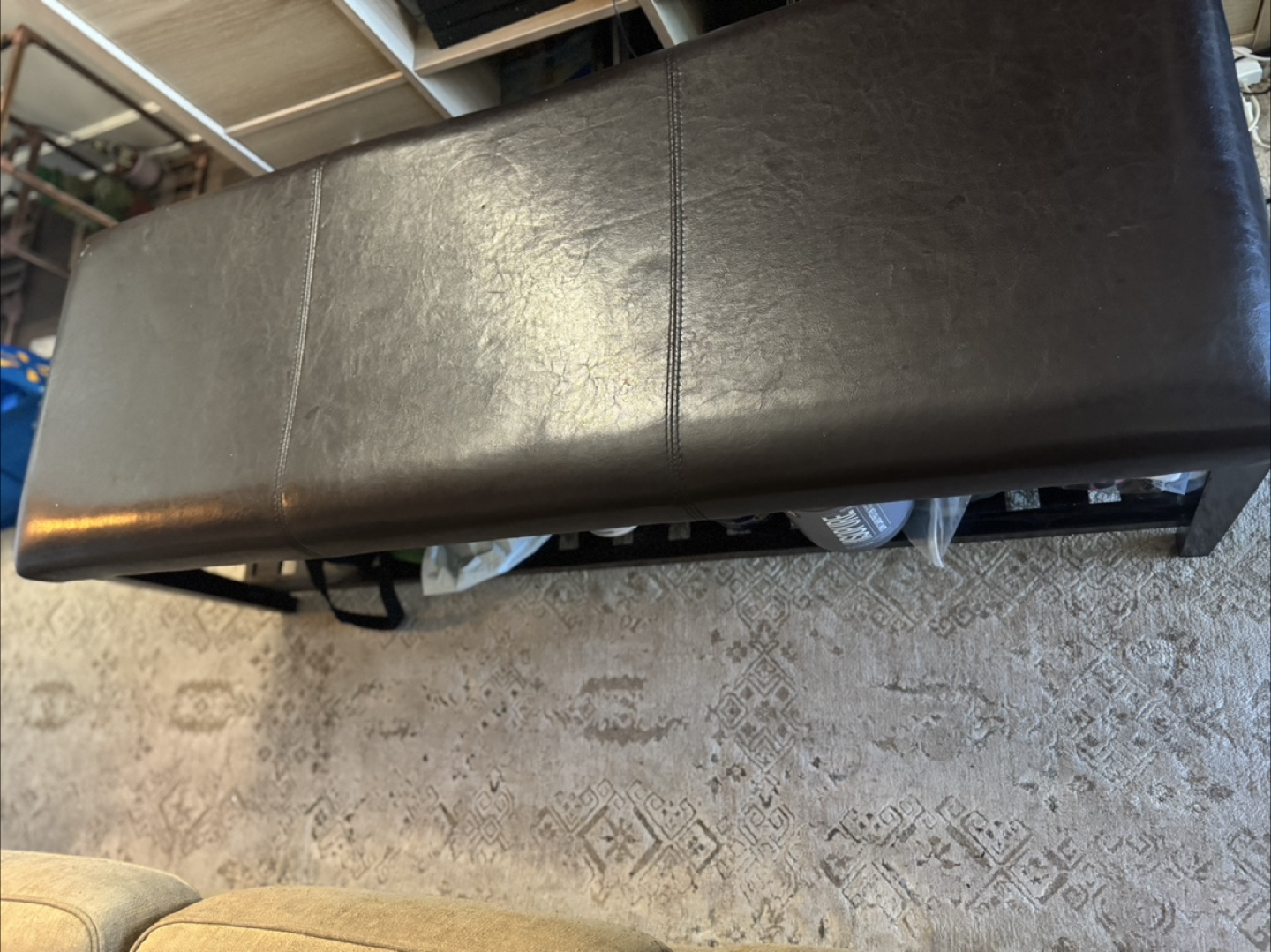 Selling a gently used brown faux leather bench. It has a shelf underneath for storage, perfect for organizing shoes or other items. It's sturdy and in good condition, with some minor signs of wear on the surface. Great for an entryway or living room!