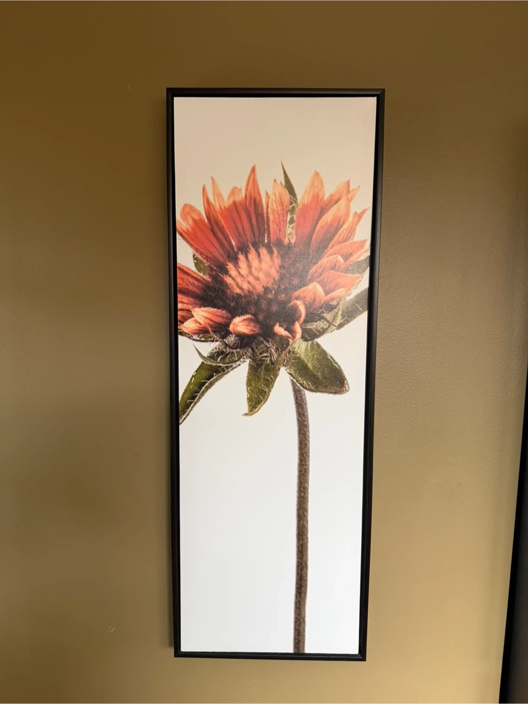 A tall, framed canvas print featuring a close-up of a vibrant orange and red flower. It's set against a clean white background with a thin black frame. This piece adds a pop of colour to any room!