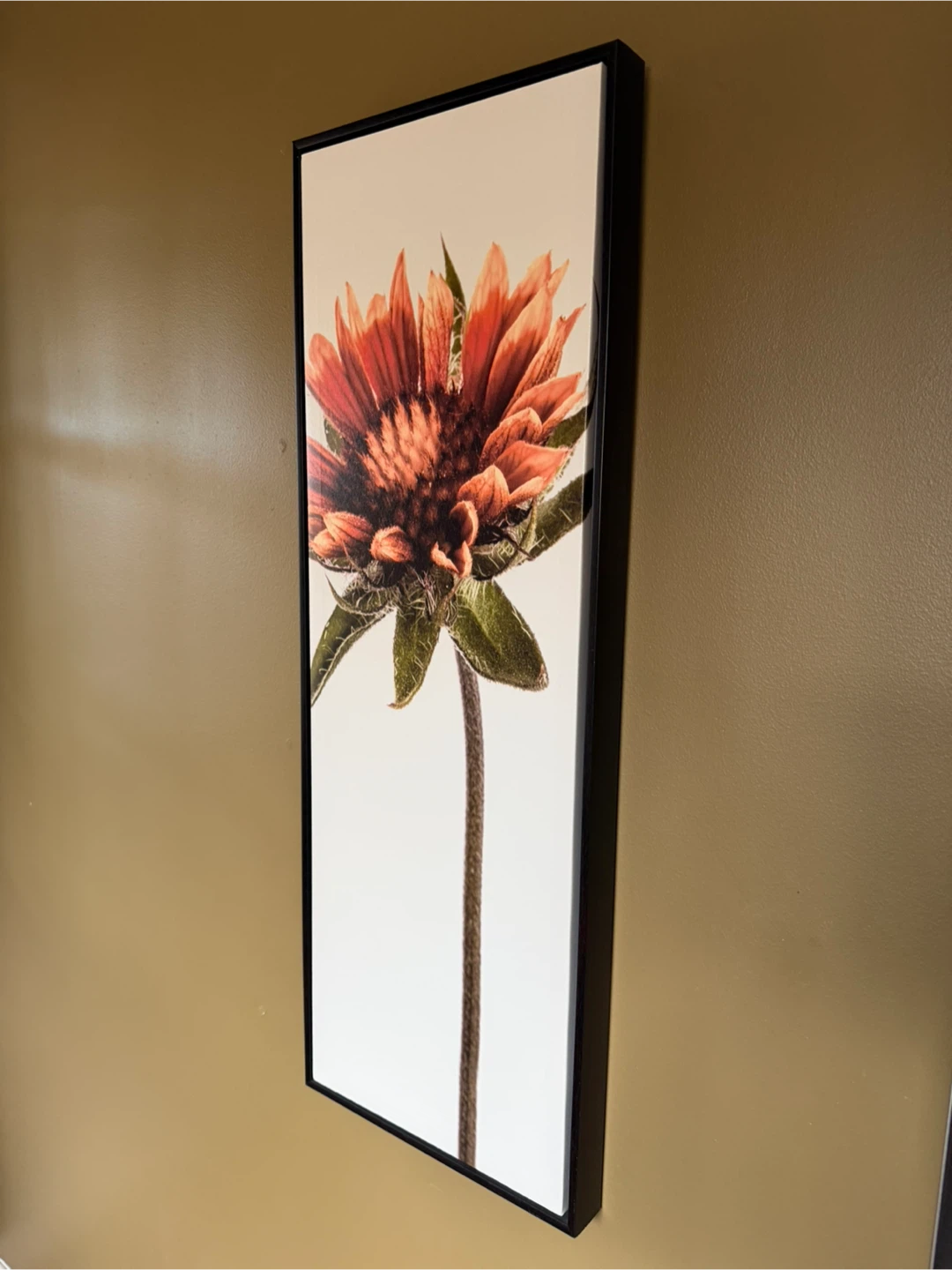 A tall, framed canvas print featuring a close-up of a vibrant orange and red flower. It's set against a clean white background with a thin black frame. This piece adds a pop of colour to any room!