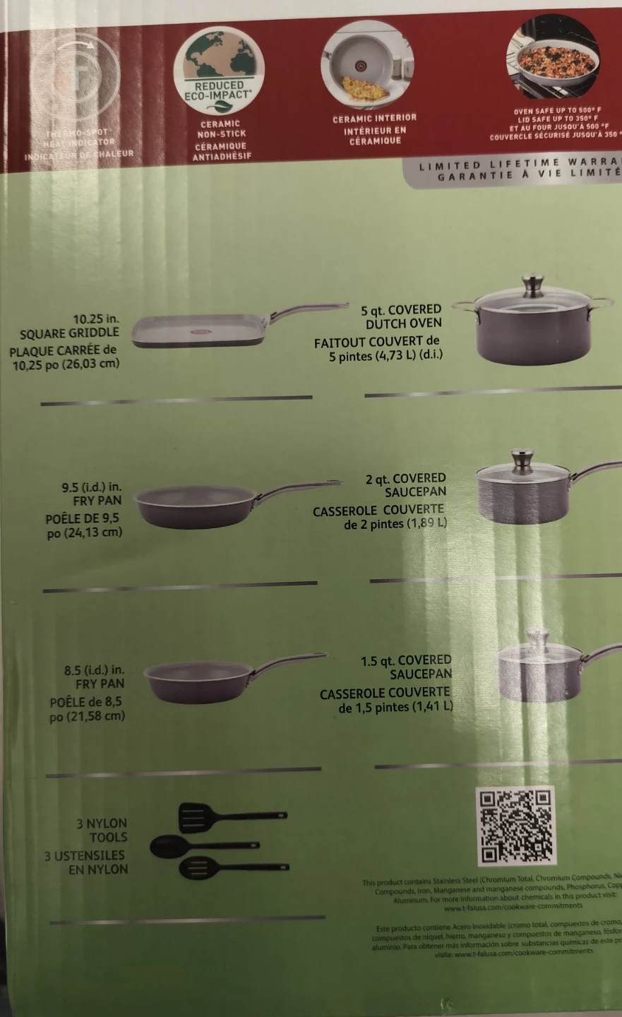 This T-fal 12-piece cookware set features a 100% recycled aluminum body with a ceramic non-stick interior. It includes a 10.25-inch square griddle, an 8.5-inch fry pan, a 9.5-inch fry pan, a 1.5-quart covered saucepan, a 2-quart covered saucepan, and a 5-quart Dutch oven. Also includes 3 nylon cooking utensils.