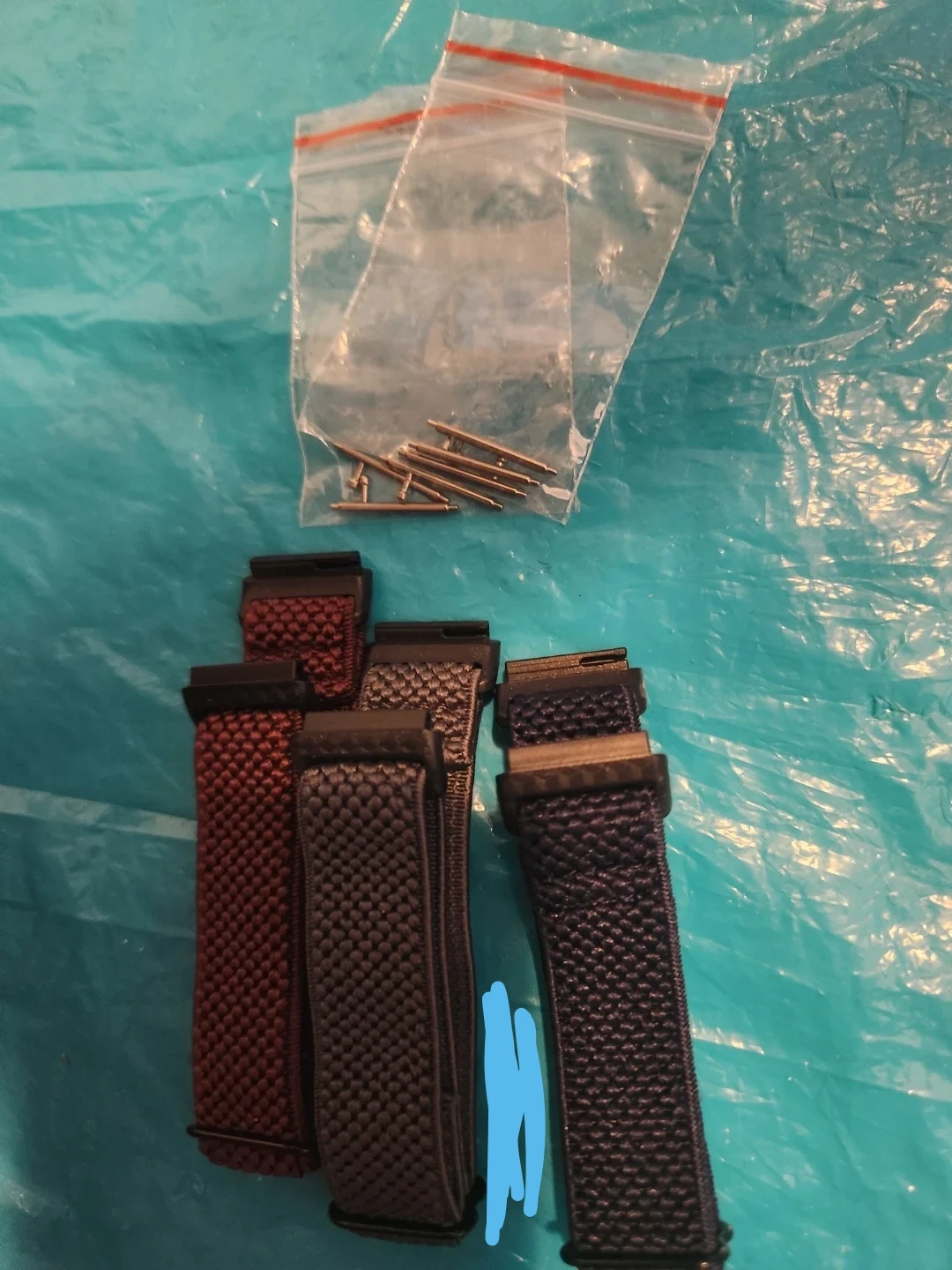 Selling a collection of watch bands and hinges/pins in various colours! Red, grey, navy blue. Includes 4 pins for attachment.