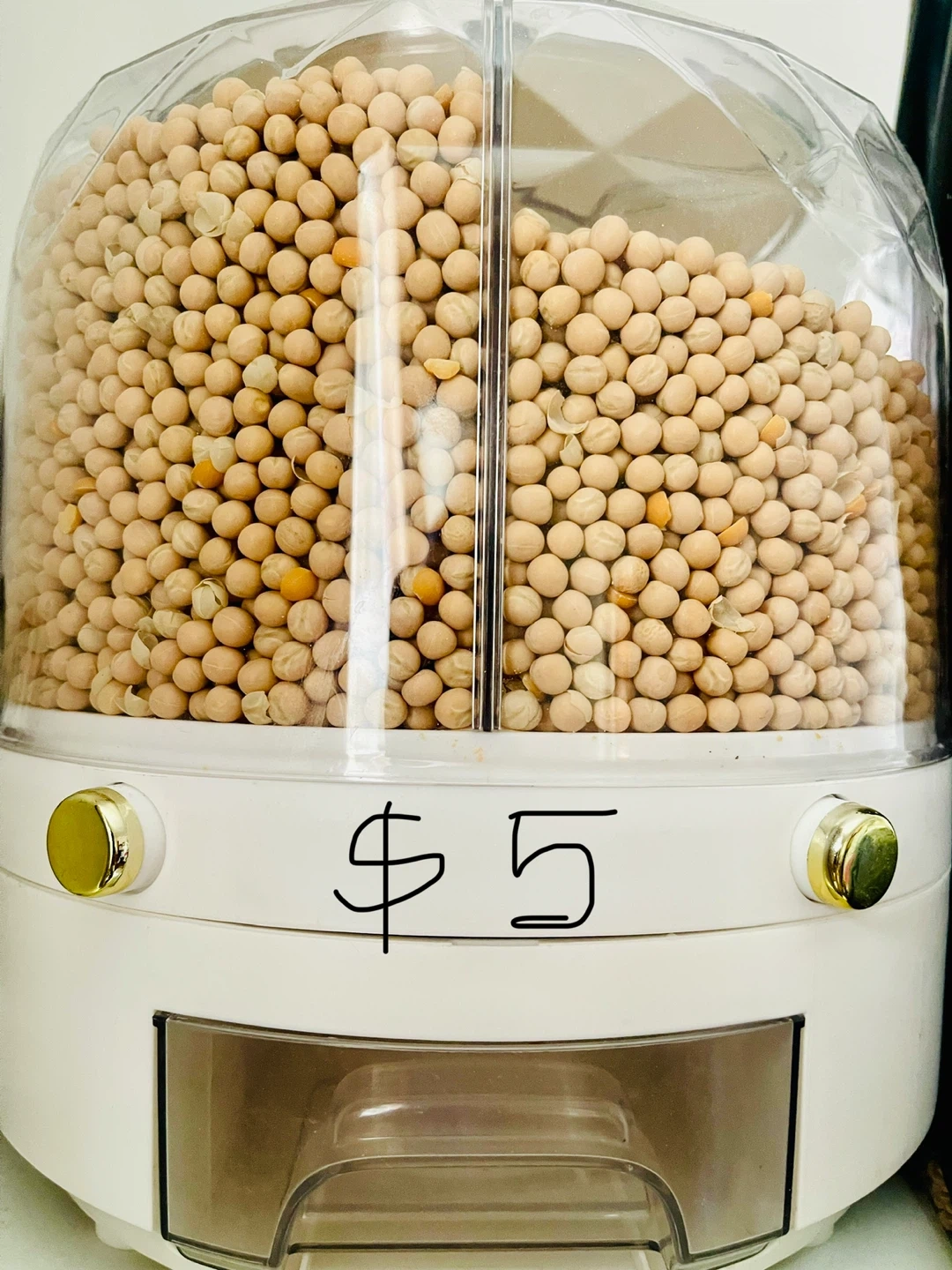 This is a clear dry food dispenser. It's perfect for storing grains, beans, or snacks. The dispenser has a 5 compartment design for easy portioning. Dispenser measures approx.