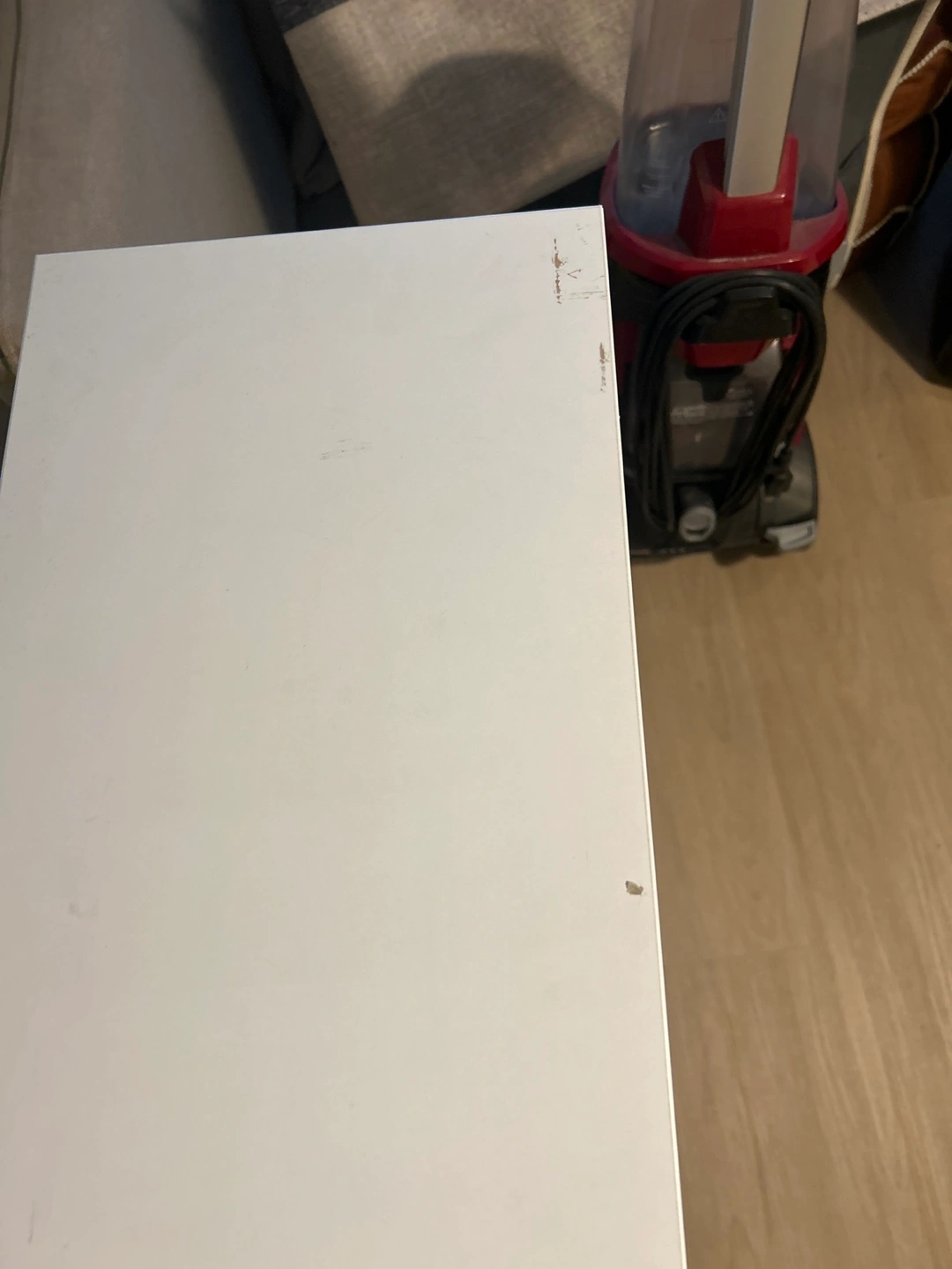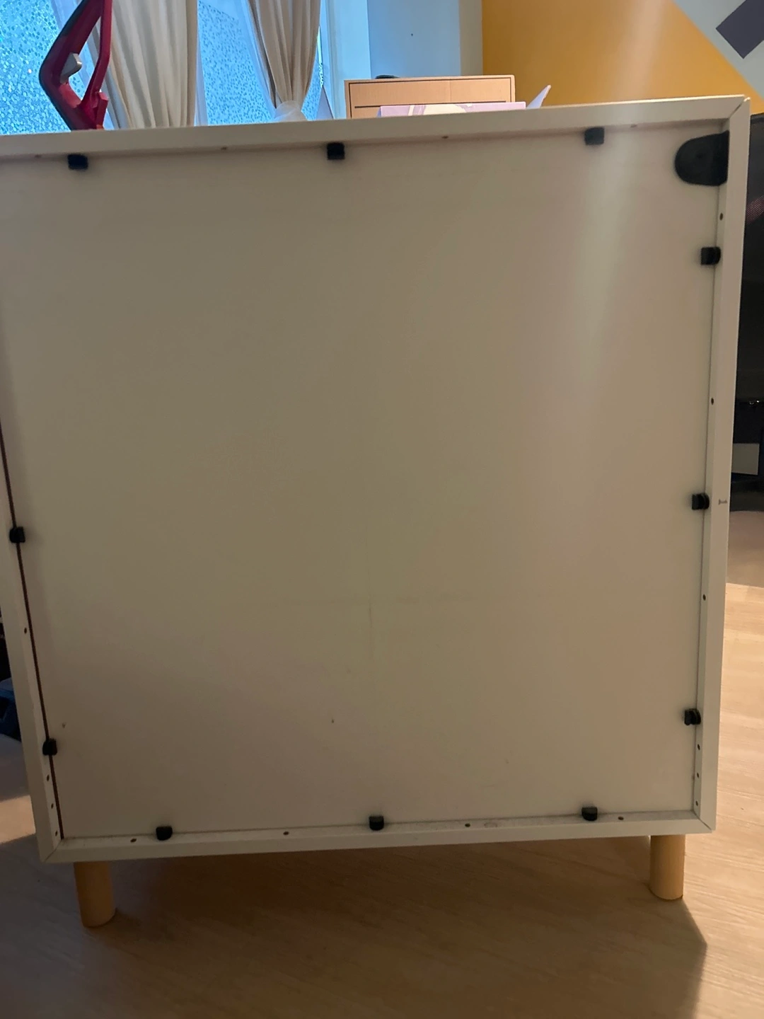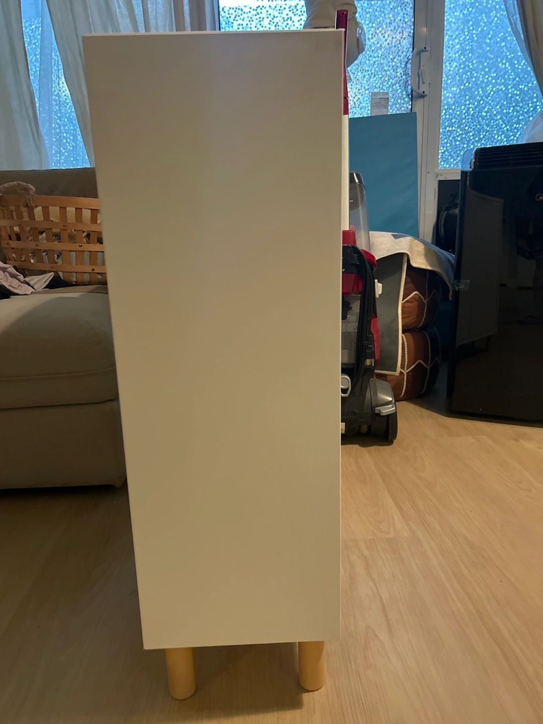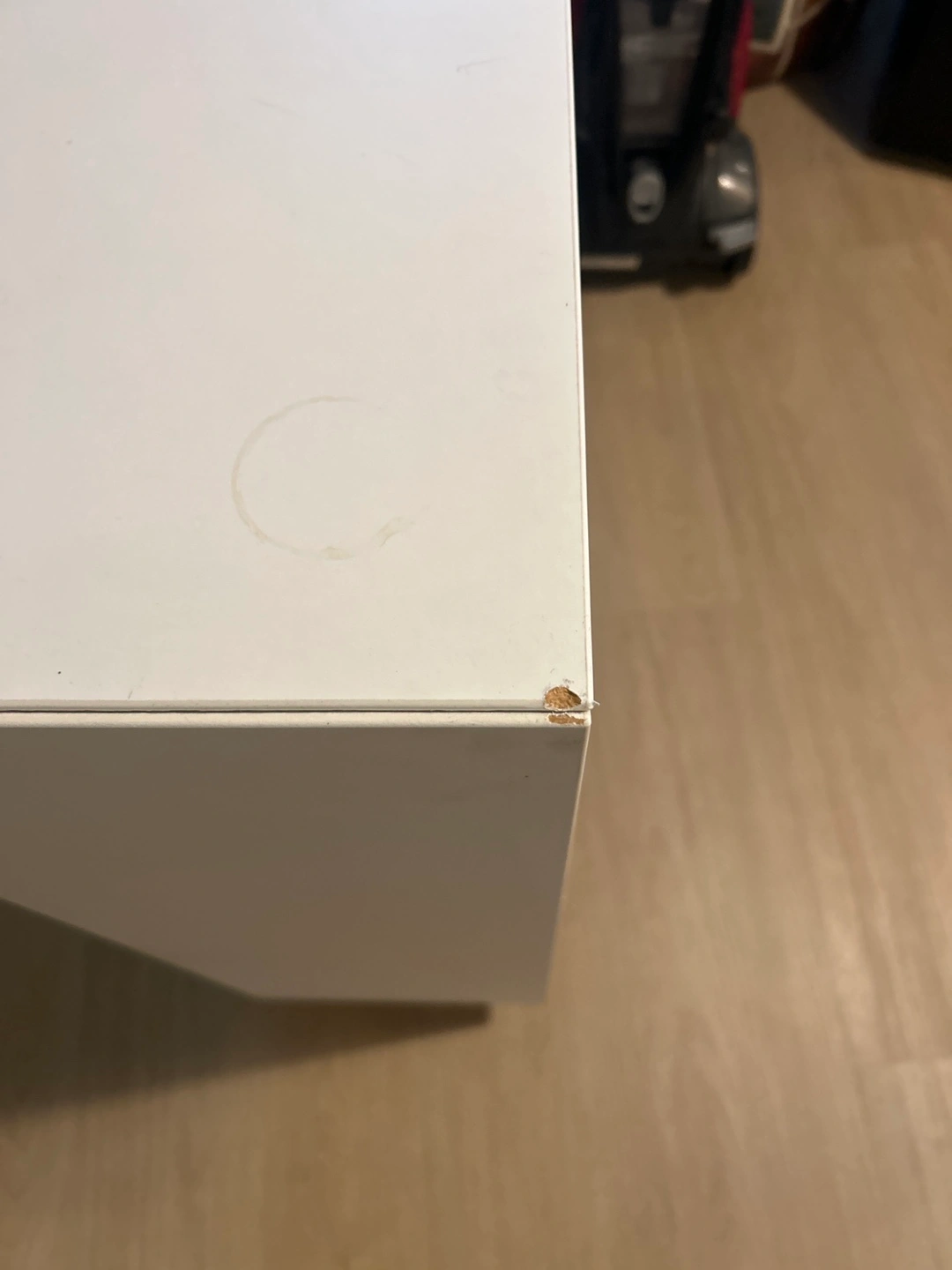 Selling a white cabinet with doors. It has a few signs of wear, including a small chip on the corner and a ring mark on top, but is otherwise in good condition. Great for extra storage!