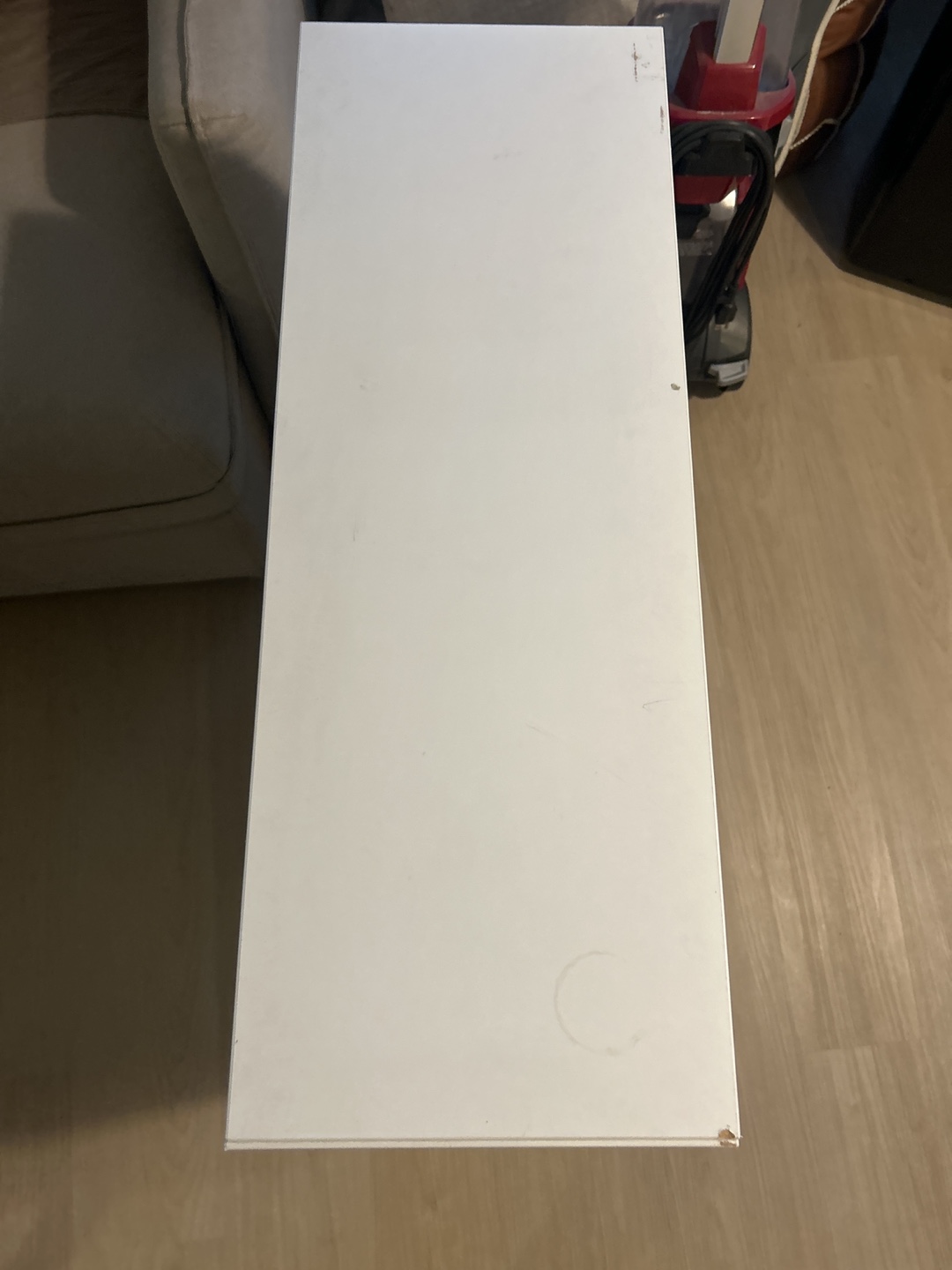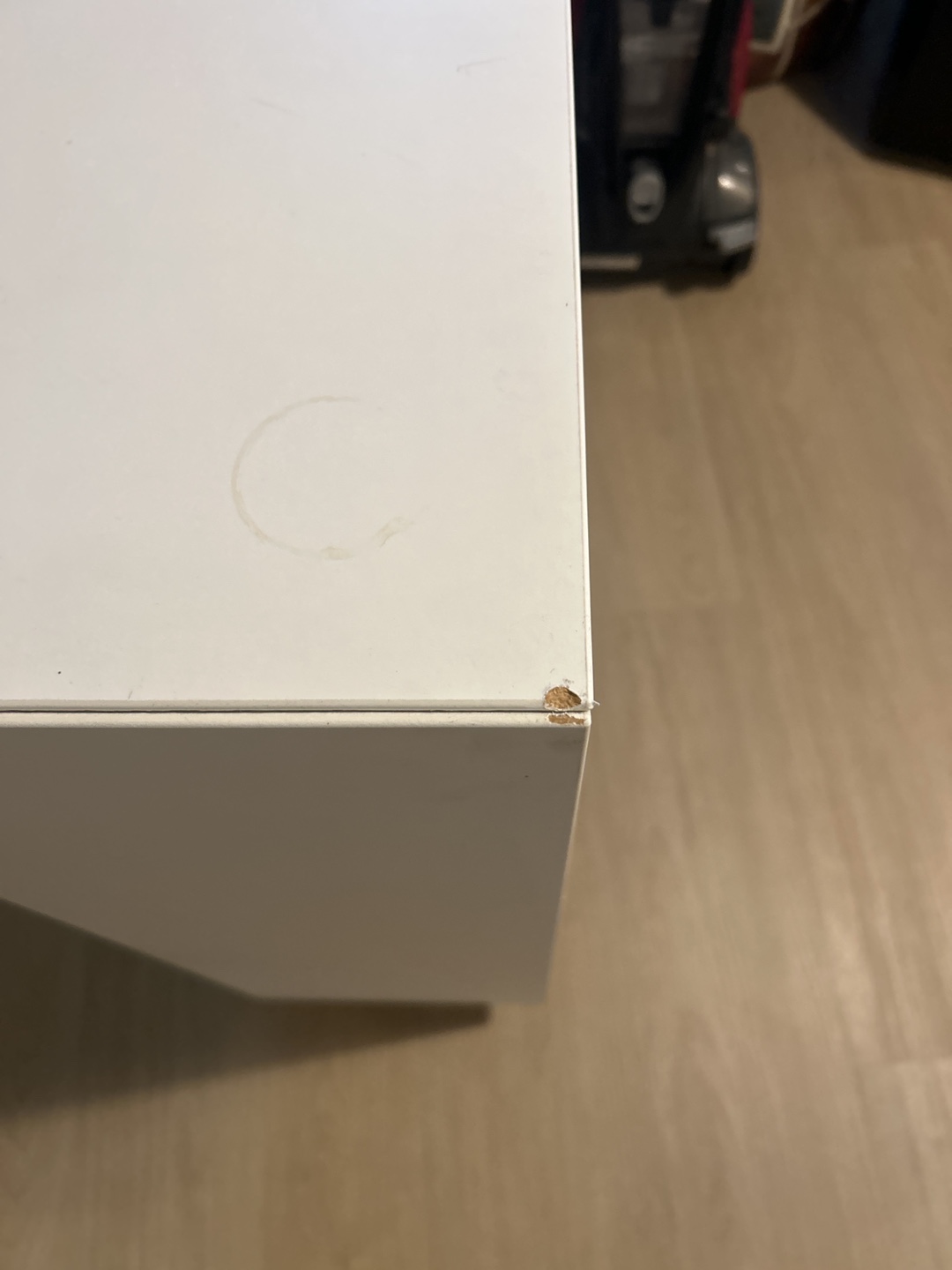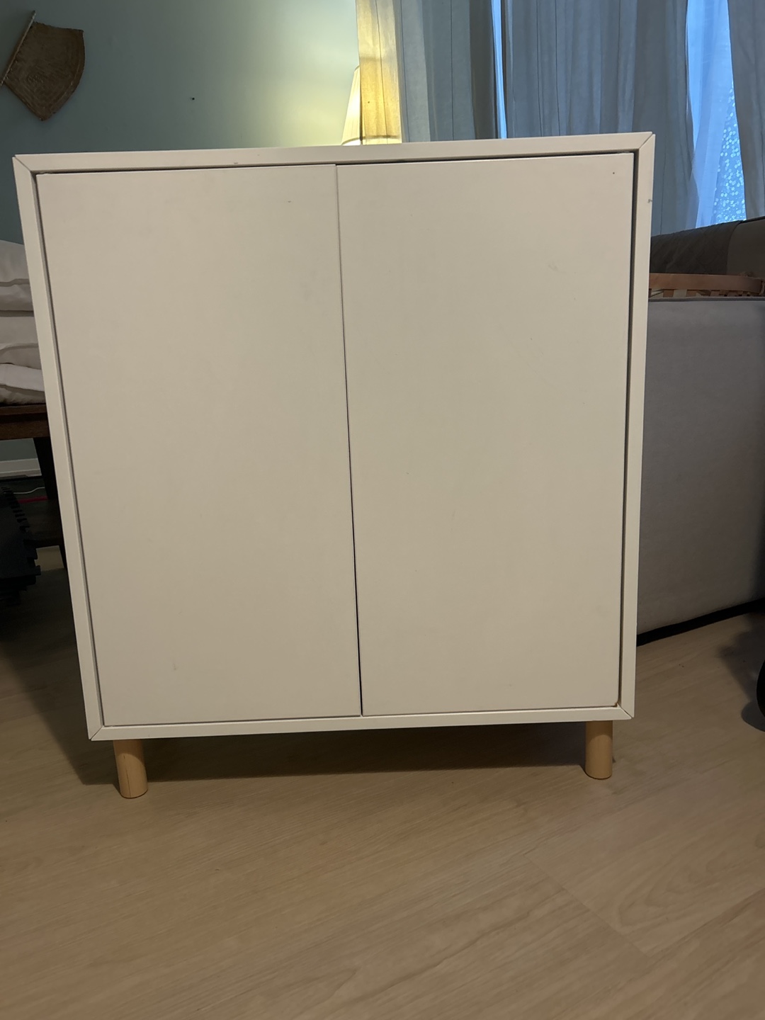 Selling a white cabinet with doors. It has a few signs of wear, including a small chip on the corner and a ring mark on top, but is otherwise in good condition. Great for extra storage!