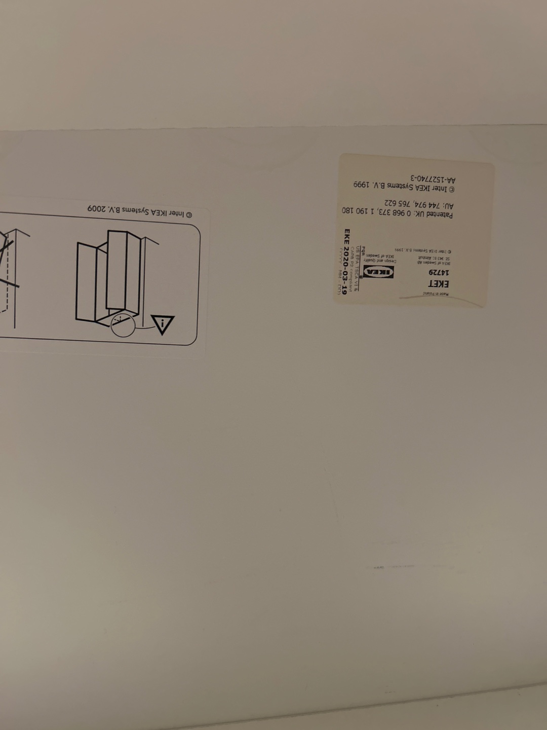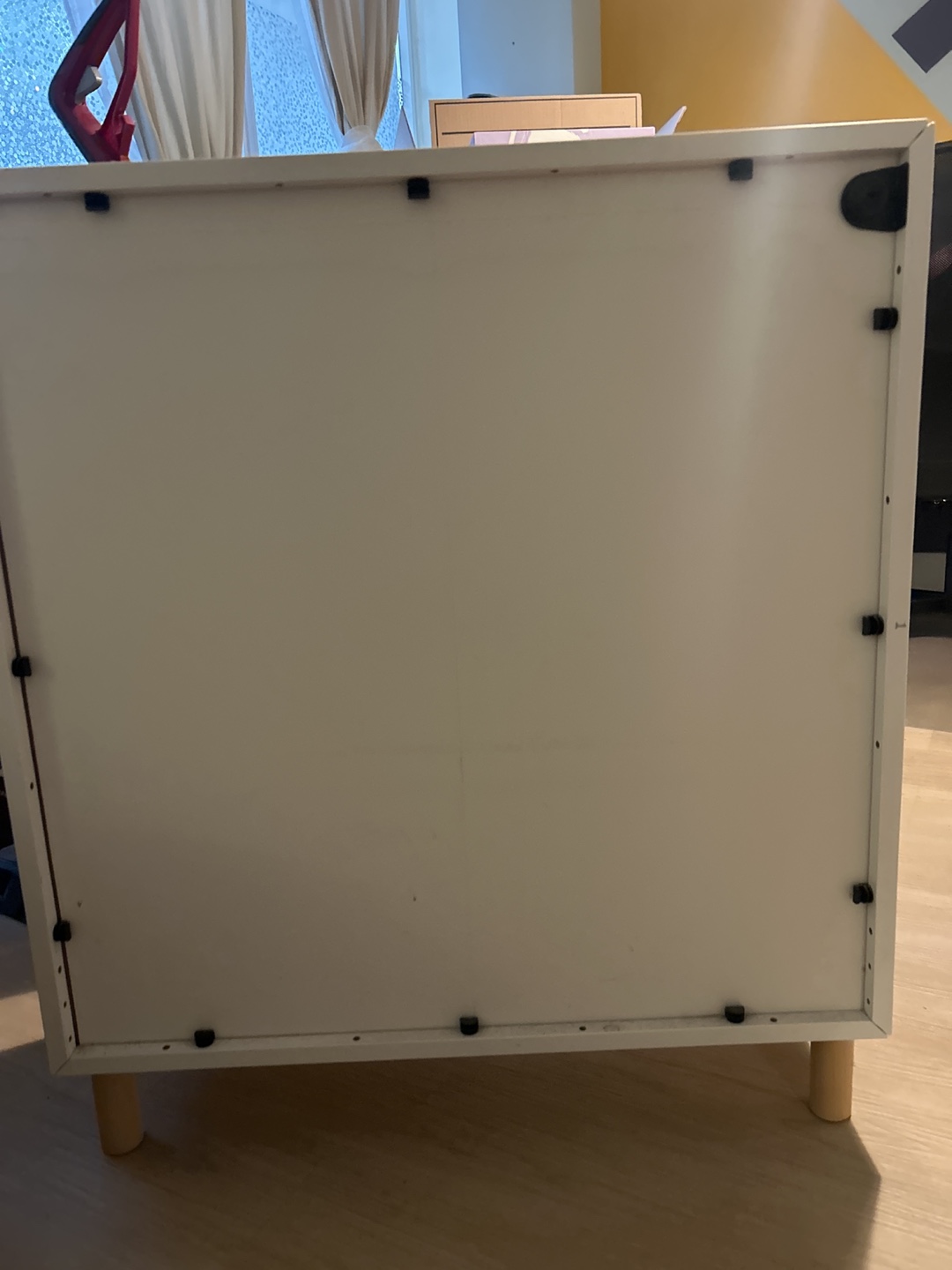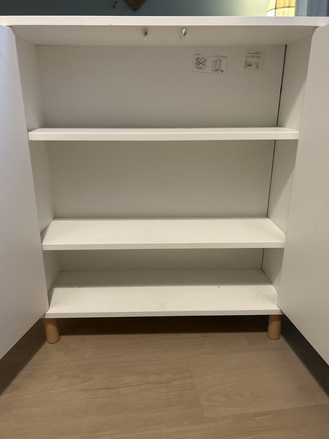 Selling a white cabinet with doors. It has a few signs of wear, including a small chip on the corner and a ring mark on top, but is otherwise in good condition. Great for extra storage!