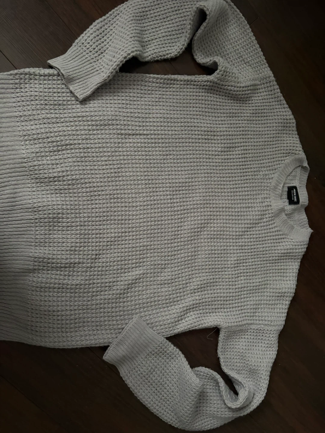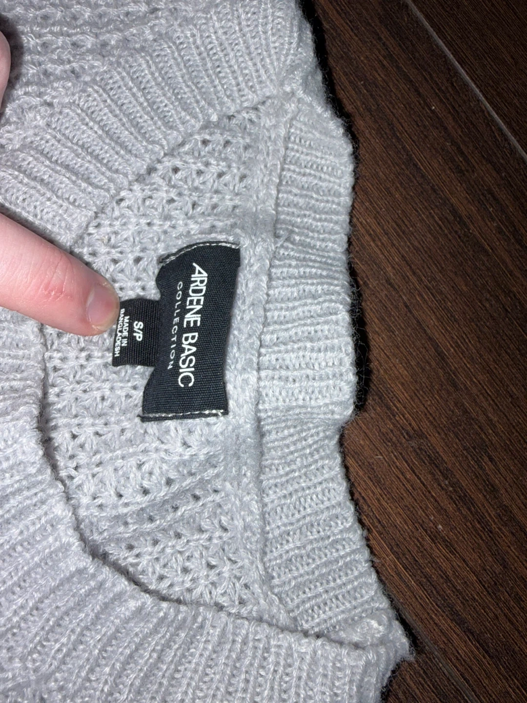 This is an Ardene Basic Collection grey knit sweater. It's a size S/P. The sweater has a waffle knit pattern. It's made from a soft knit material.