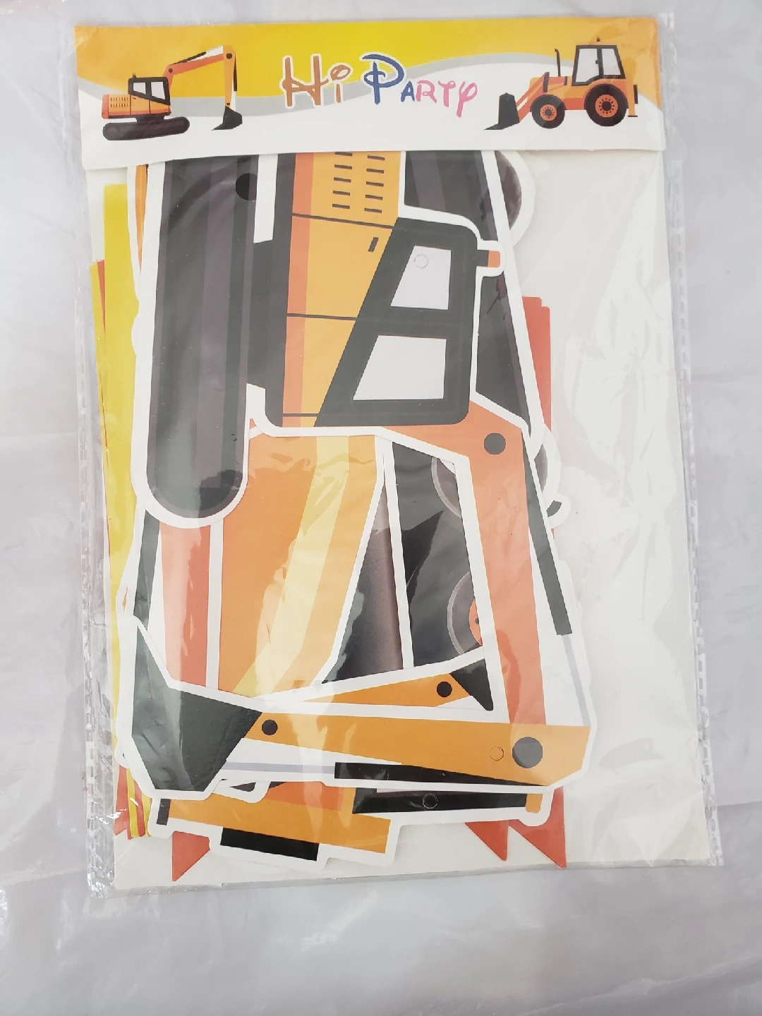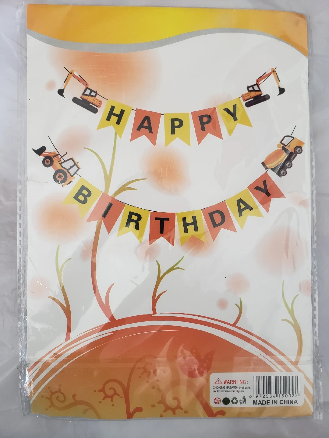 A fun Happy Birthday banner with a construction theme! Perfect for a little one's birthday party. The banner features construction vehicles like excavators and tractors.