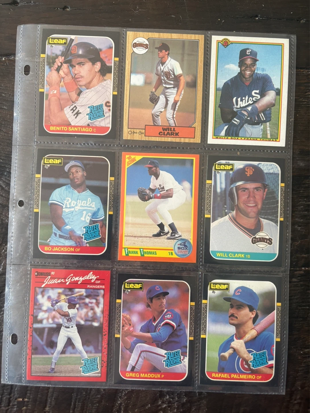 This collection includes several notable rookie cards from the 1980s and early 1990s. Cards feature players like Benito Santiago, Will Clark, Frank Thomas, Bo Jackson, Juan Gonzalez, Greg Maddux, and Rafael Palmeiro. These are from brands like Leaf, Score, and Donruss.