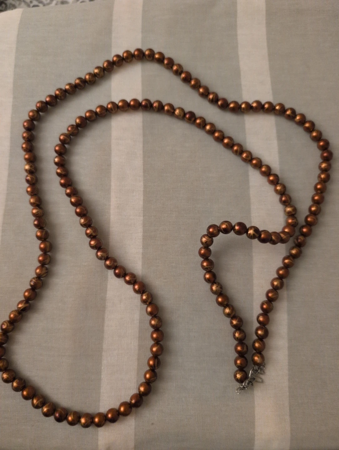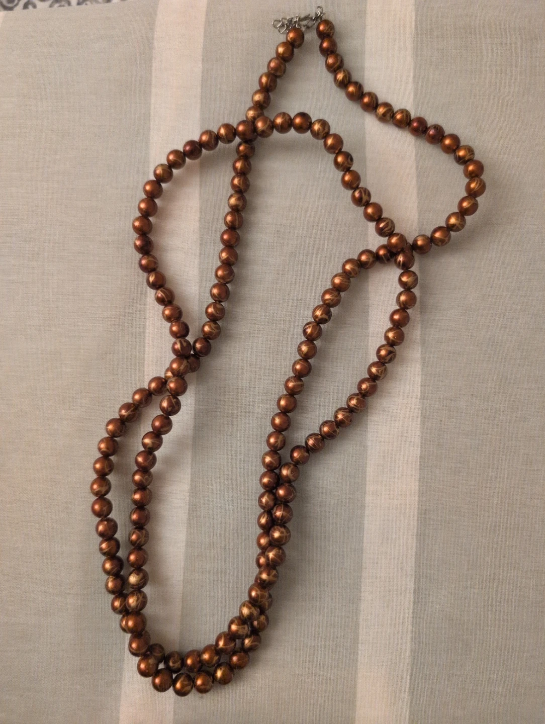 This bronze pearl necklace features a unique marbled design on each bead. It's strung on durable wire with a clasp closure. It's plastic and very lightweight , the clasp is a bit stuck but it is a long necklace so goes fully over the head or your can double it and clasp it with something else if you want a layered look.