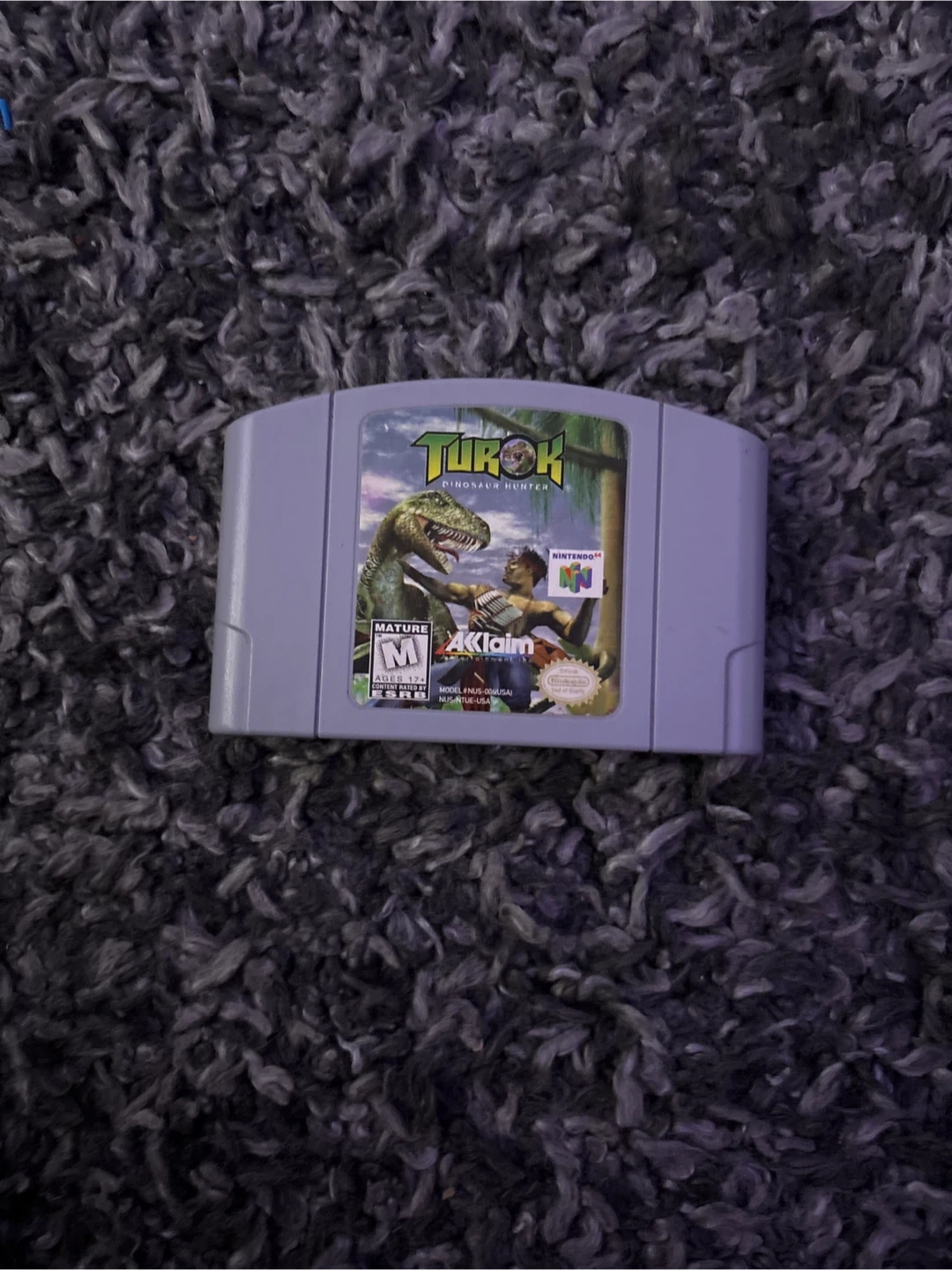 Turok: Dinosaur Hunter for the Nintendo 64. Rated M for Mature. This is just the game cartridge.